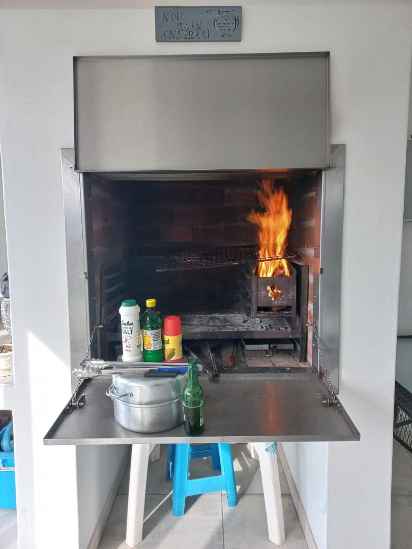Built in braai room with stainless steel braai and stacka doors to keep the heat and atmosphere inside or open onto the patio with a well maintained garden including irrigation installed making upkeep of this garden a breeze.