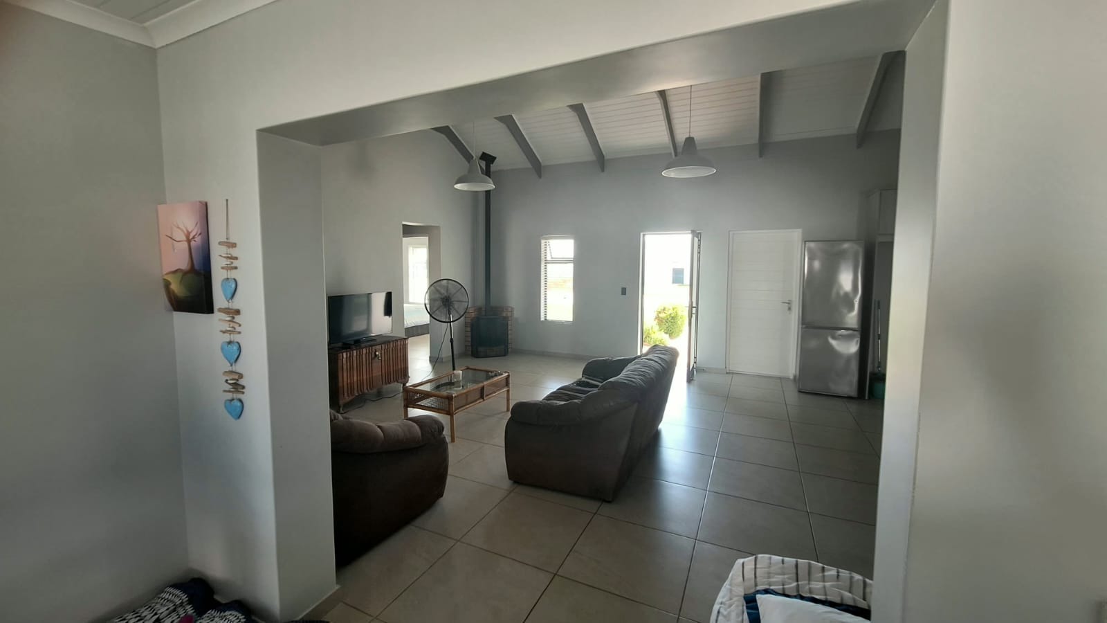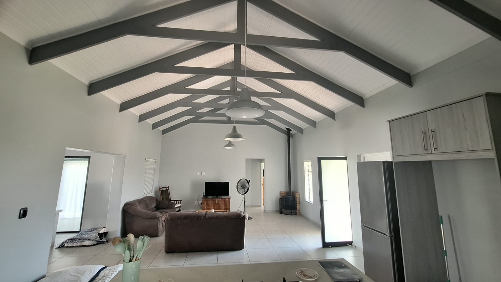 As you enter the home, you are welcomed into a spacious open-plan living area that seamlessly combines the kitchen, dining, and lounge spaces. The high ceilings with exposed trusses create a light and airy atmosphere, while the cozy Jetmaster fireplace (kaggel) adds warmth and character, making it the perfect space for both entertaining and family living.