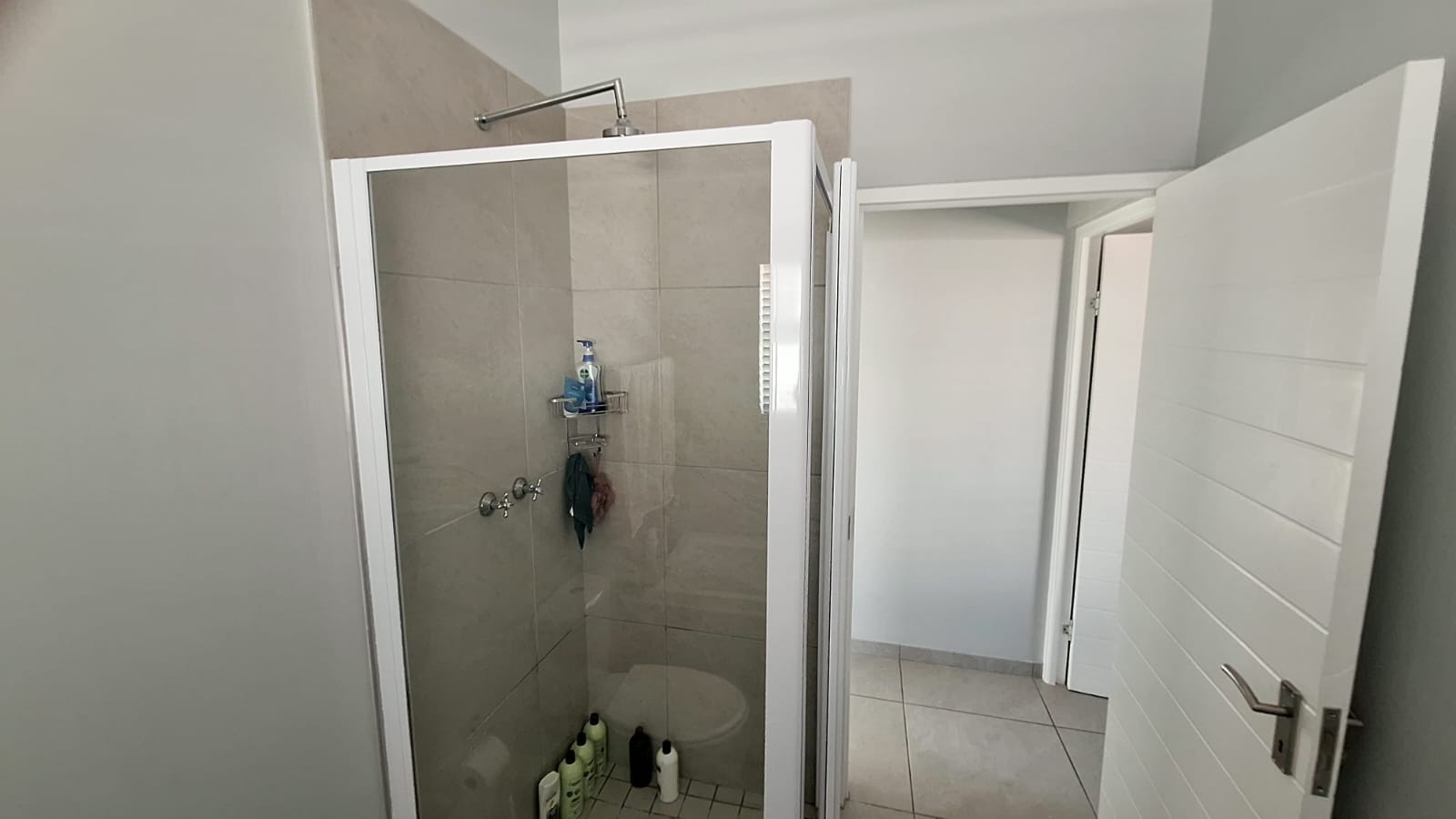 The layout of the home offers excellent privacy. The main bedroom is situated on one side of the house and features double built-in cupboards, a modern en-suite bathroom with shower, and direct access to the back garden. On the opposite side of the home are two well-sized bedrooms, both with built-in cupboards, serviced by a full family bathroom.