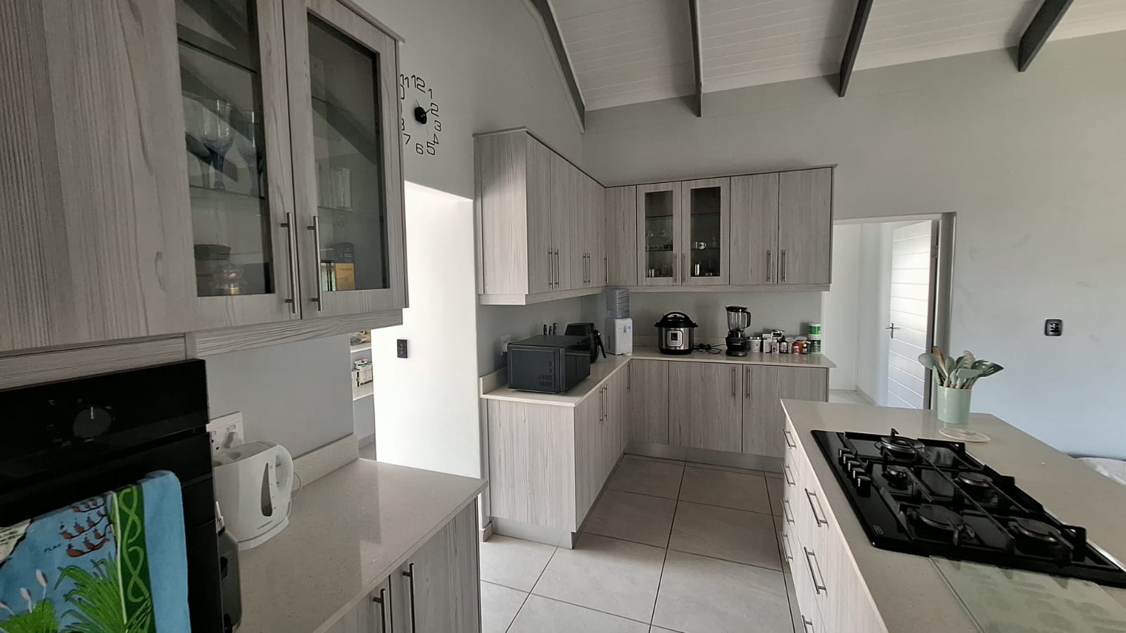 The modern kitchen is a true highlight of the home, designed with both functionality and style in mind. It features ample built-in cupboards, elegant granite countertops, a practical centre island, and a five-plate gas stove with eye-level oven. Adjacent to the kitchen is a well-designed separate scullery and laundry area, complete with a convenient walk-in pantry, offering additional storage and keeping the main living area neat and organized.
