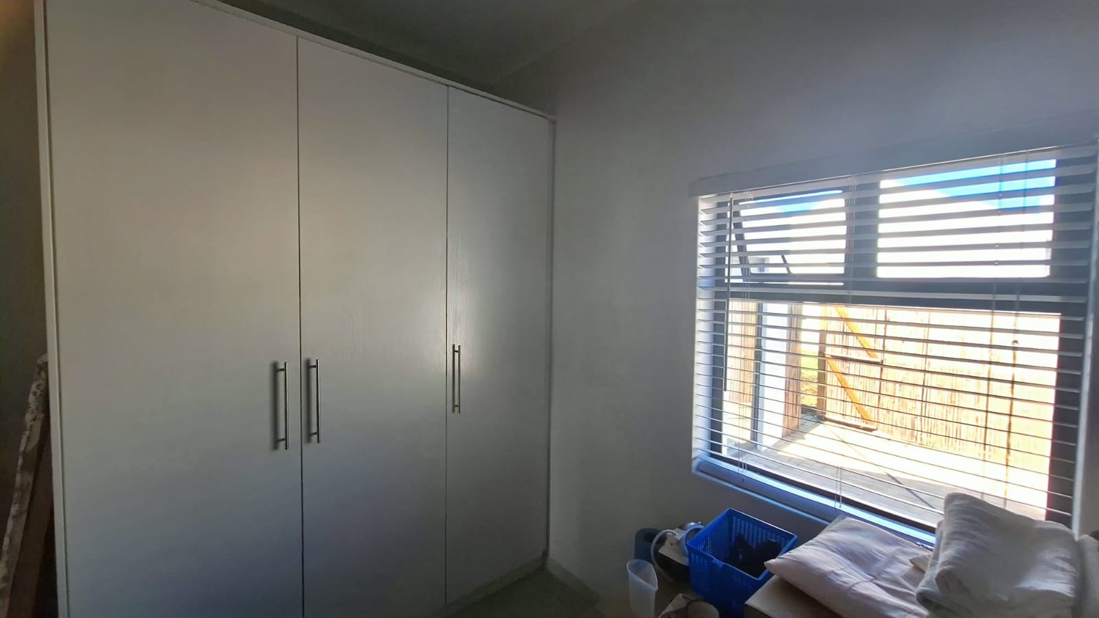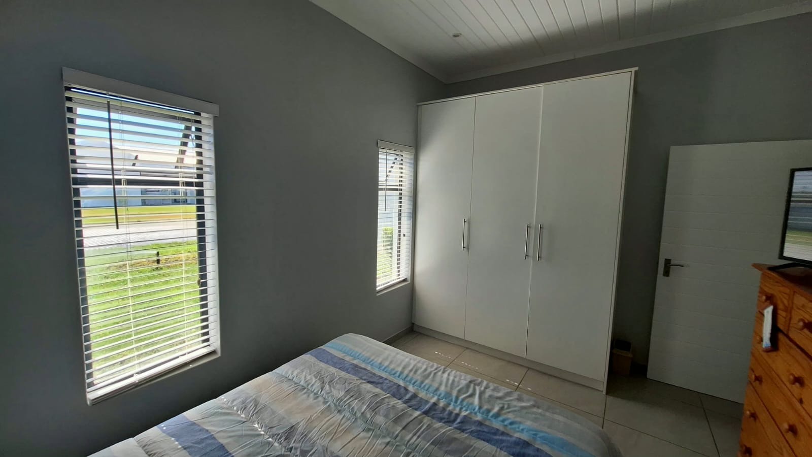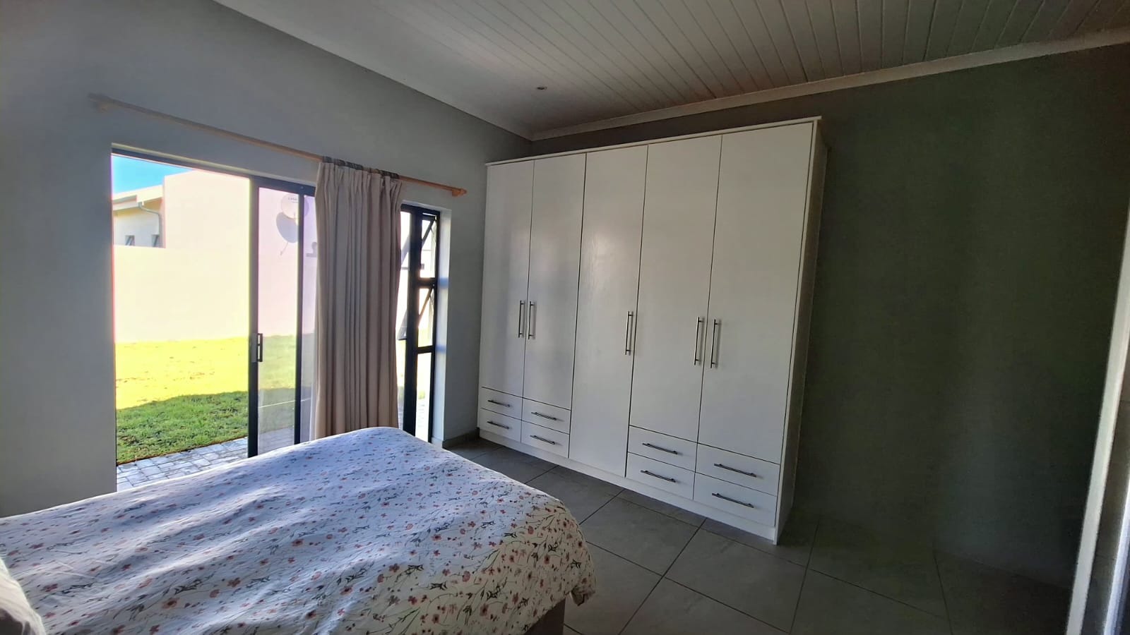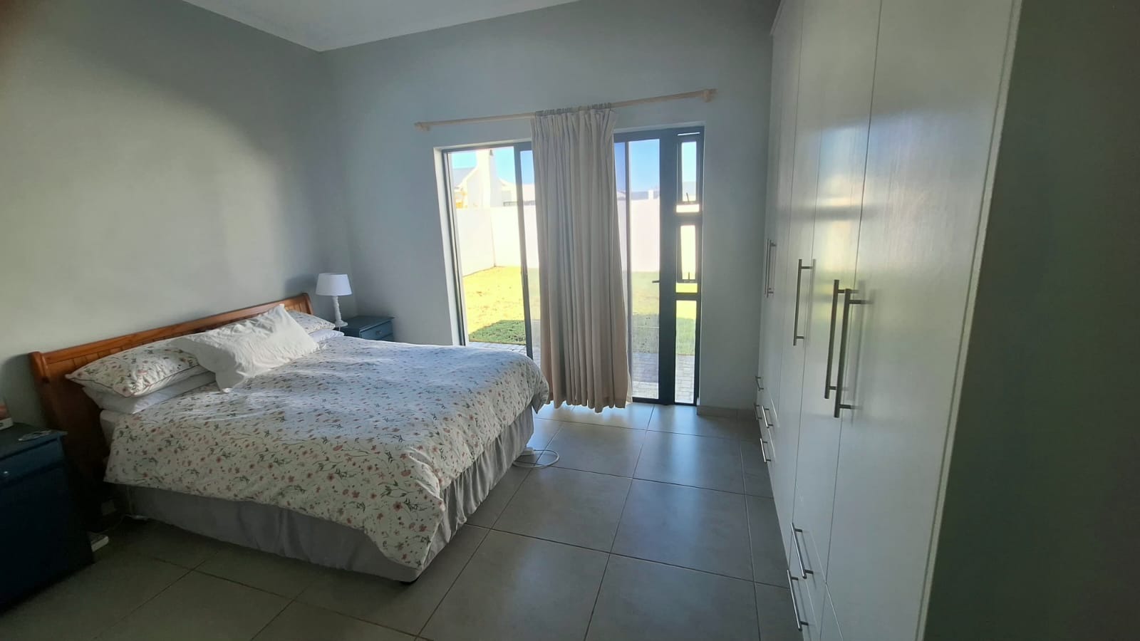 The layout of the home offers excellent privacy. The main bedroom is situated on one side of the house and features double built-in cupboards, a modern en-suite bathroom with shower, and direct access to the back garden. On the opposite side of the home are two well-sized bedrooms, both with built-in cupboards, serviced by a full family bathroom.