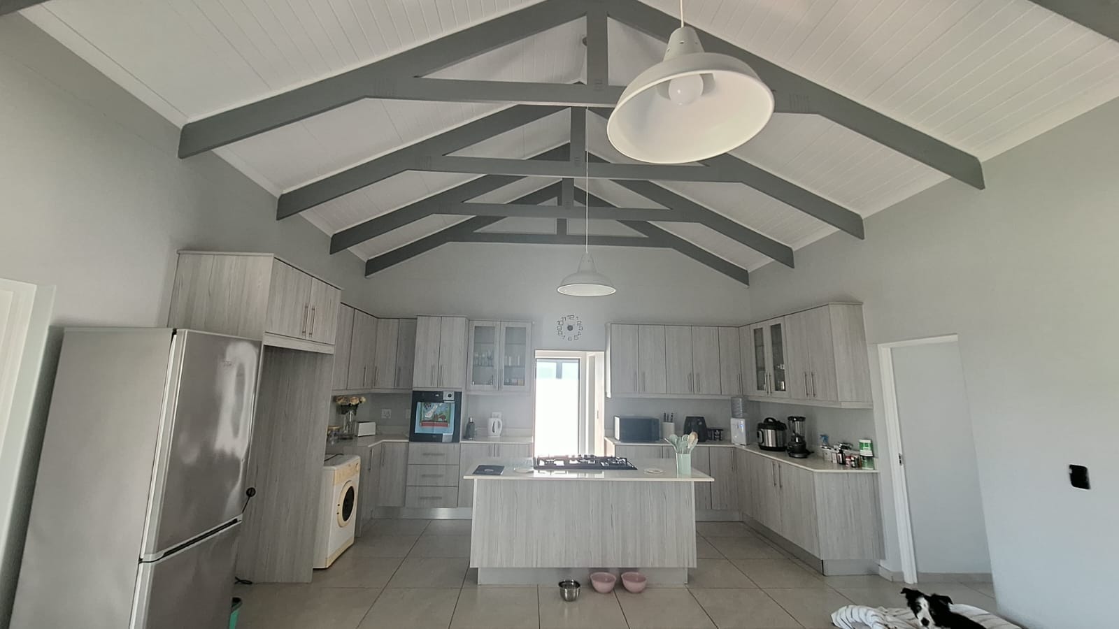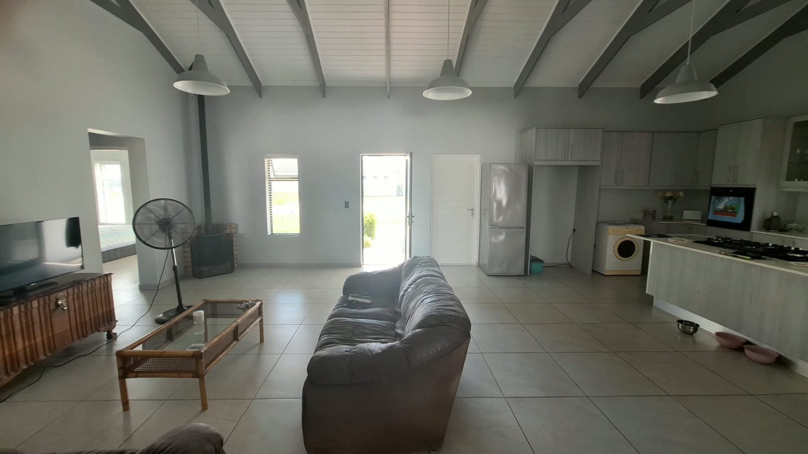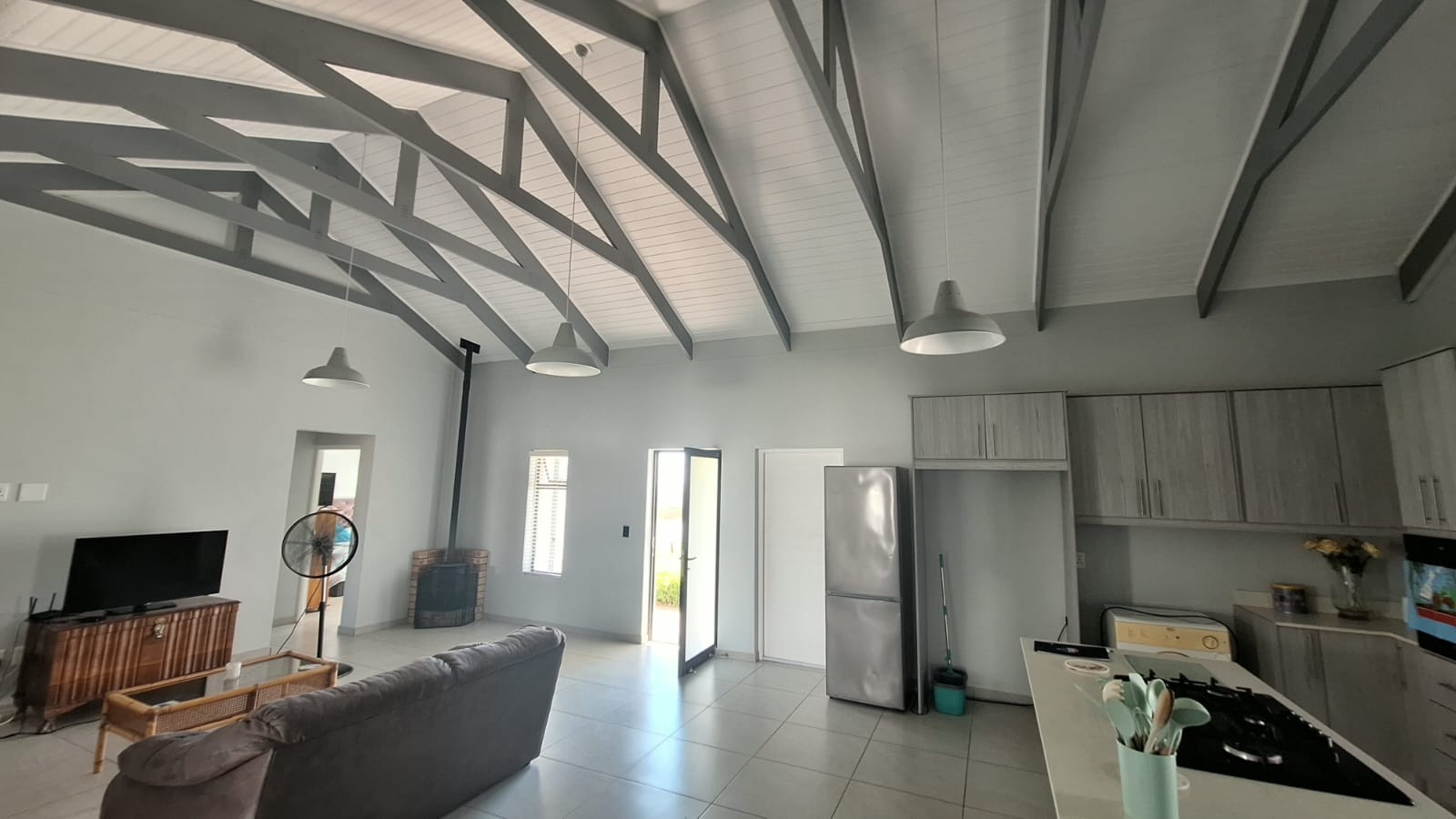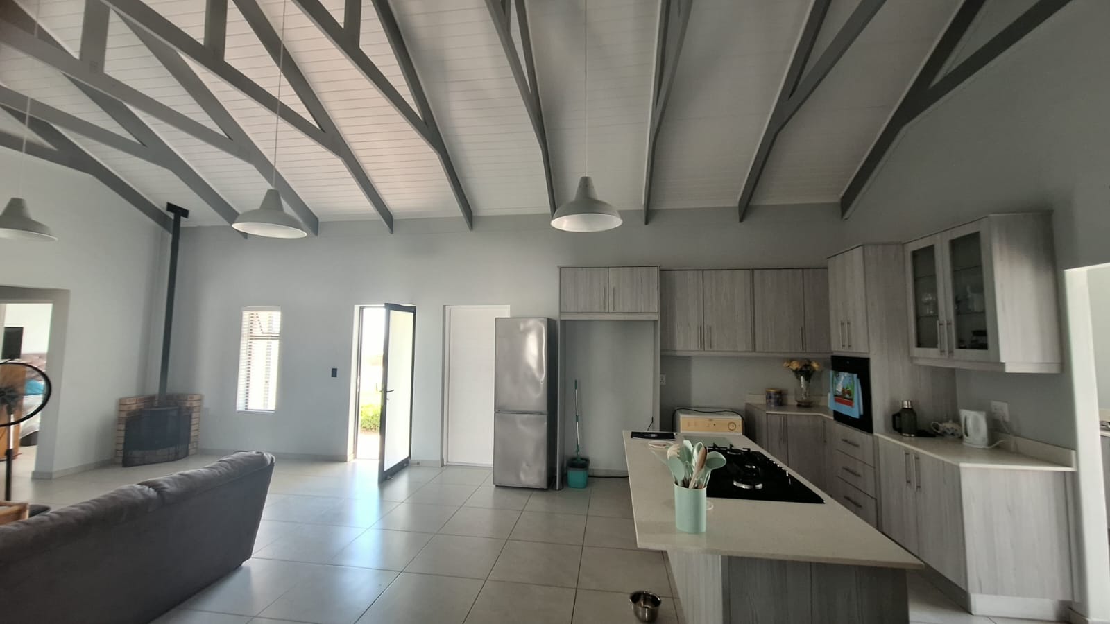 As you enter the home, you are welcomed into a spacious open-plan living area that seamlessly combines the kitchen, dining, and lounge spaces. The high ceilings with exposed trusses create a light and airy atmosphere, while the cozy Jetmaster fireplace (kaggel) adds warmth and character, making it the perfect space for both entertaining and family living.