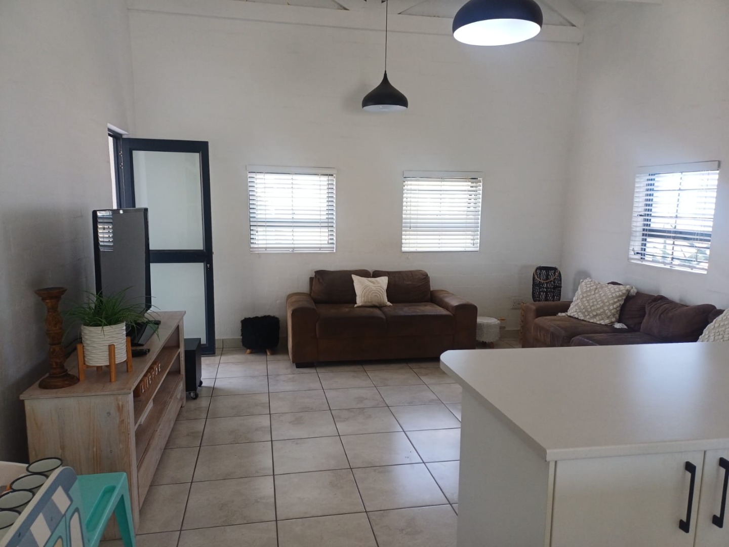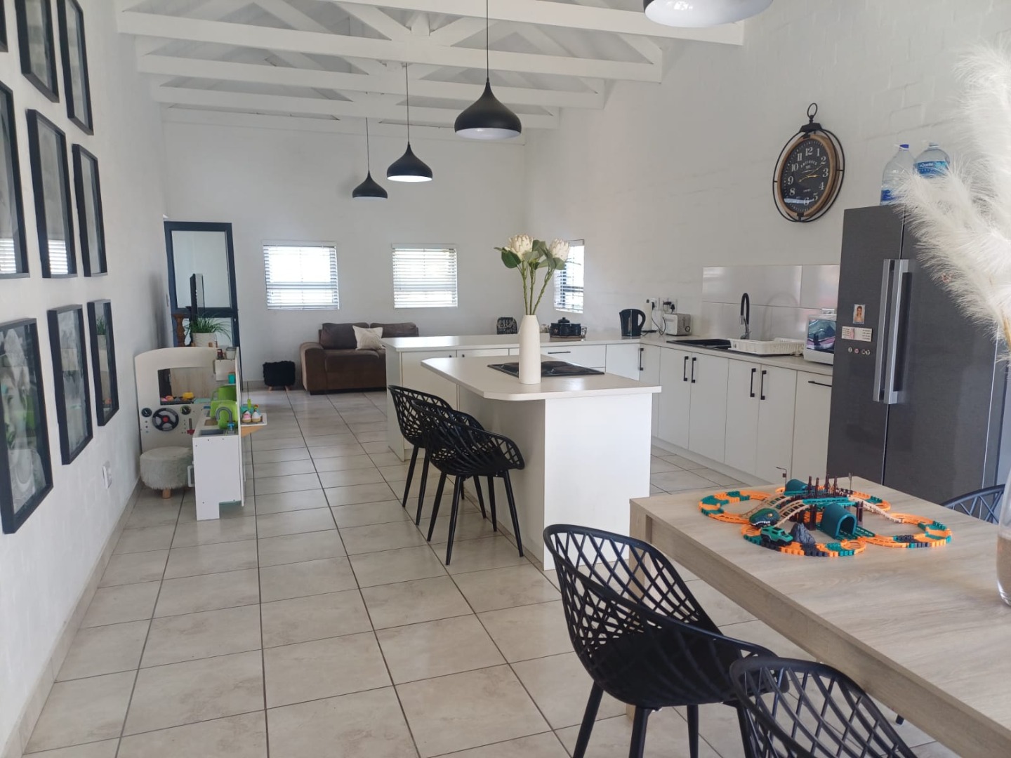 The high vaulted ceilings with exposed beams add a touch of character, while the neutral tiled flooring keeps things neat and easy to maintain.
