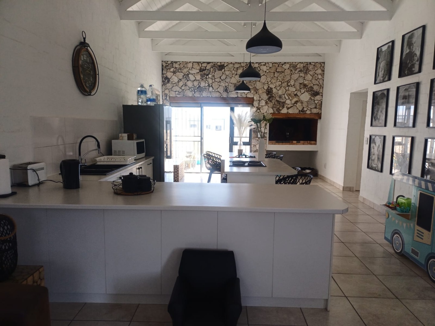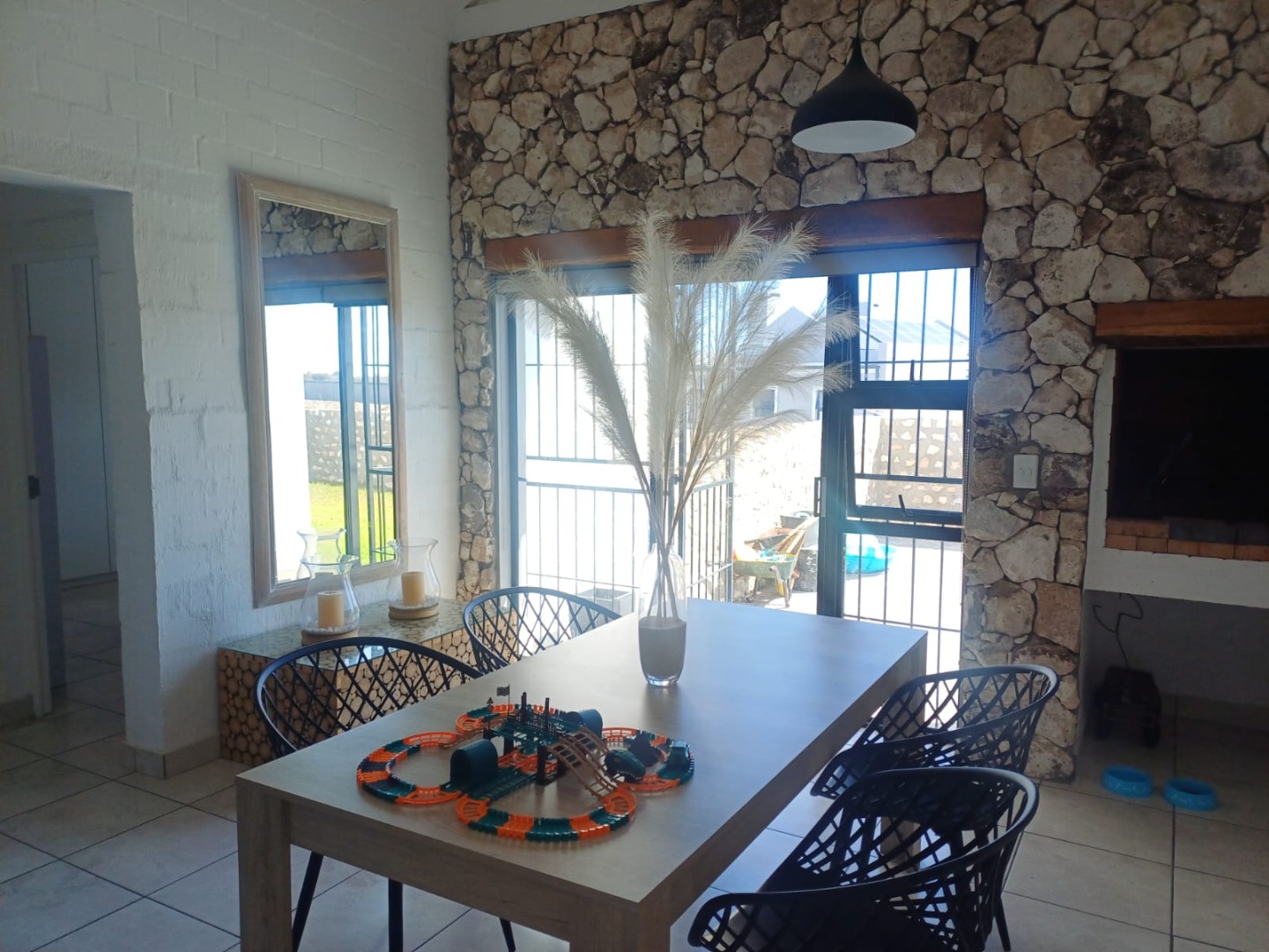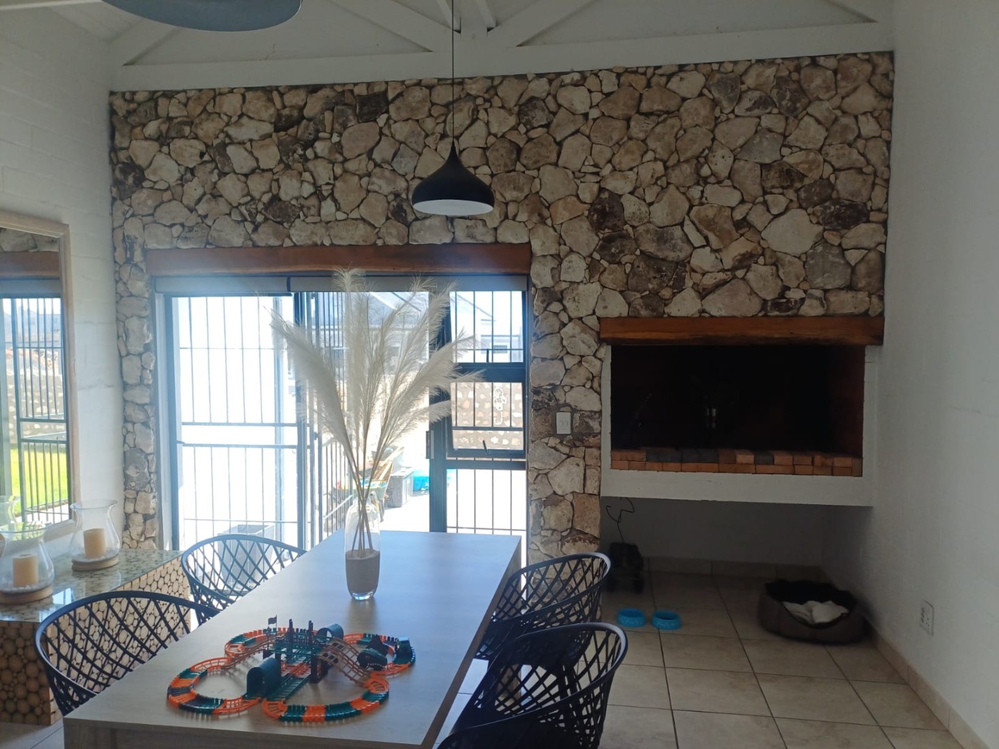 One of the coolest features has to be the dedicated braai area, complete with a striking stone accent wall and a built-in braai.