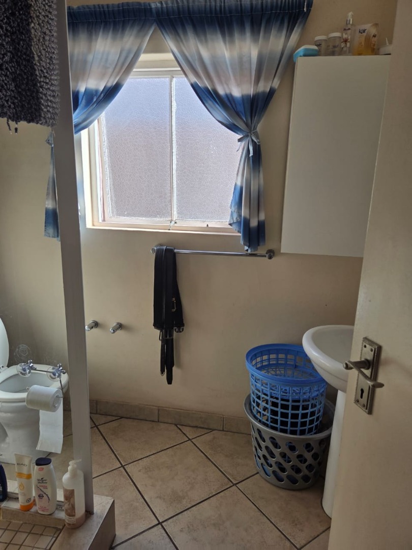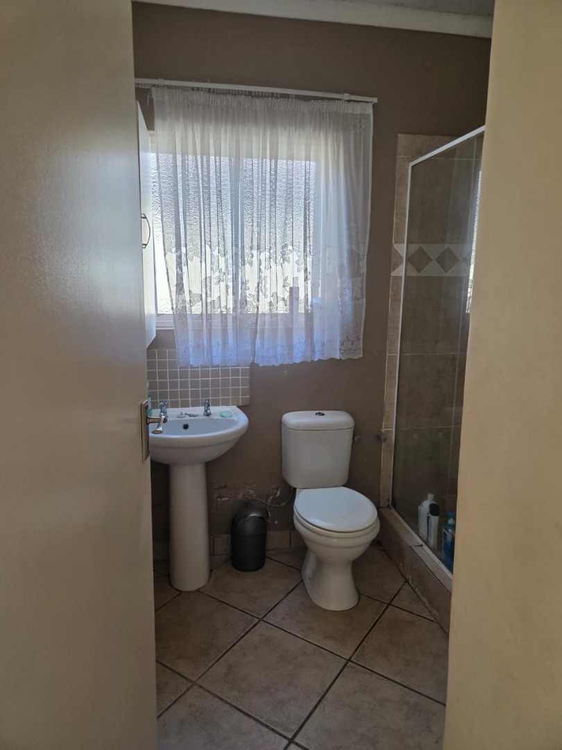 The residence comprises three well-proportioned bedrooms, each featuring durable tiled flooring and benefiting from natural light, creating inviting personal spaces. There are two bathrooms, both fitted with essential fixtures including a pedestal sink and toilet, with one offering a glass-enclosed shower for convenience.