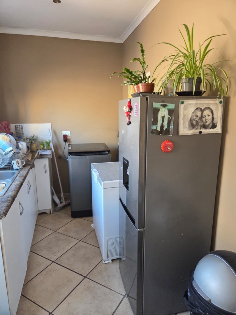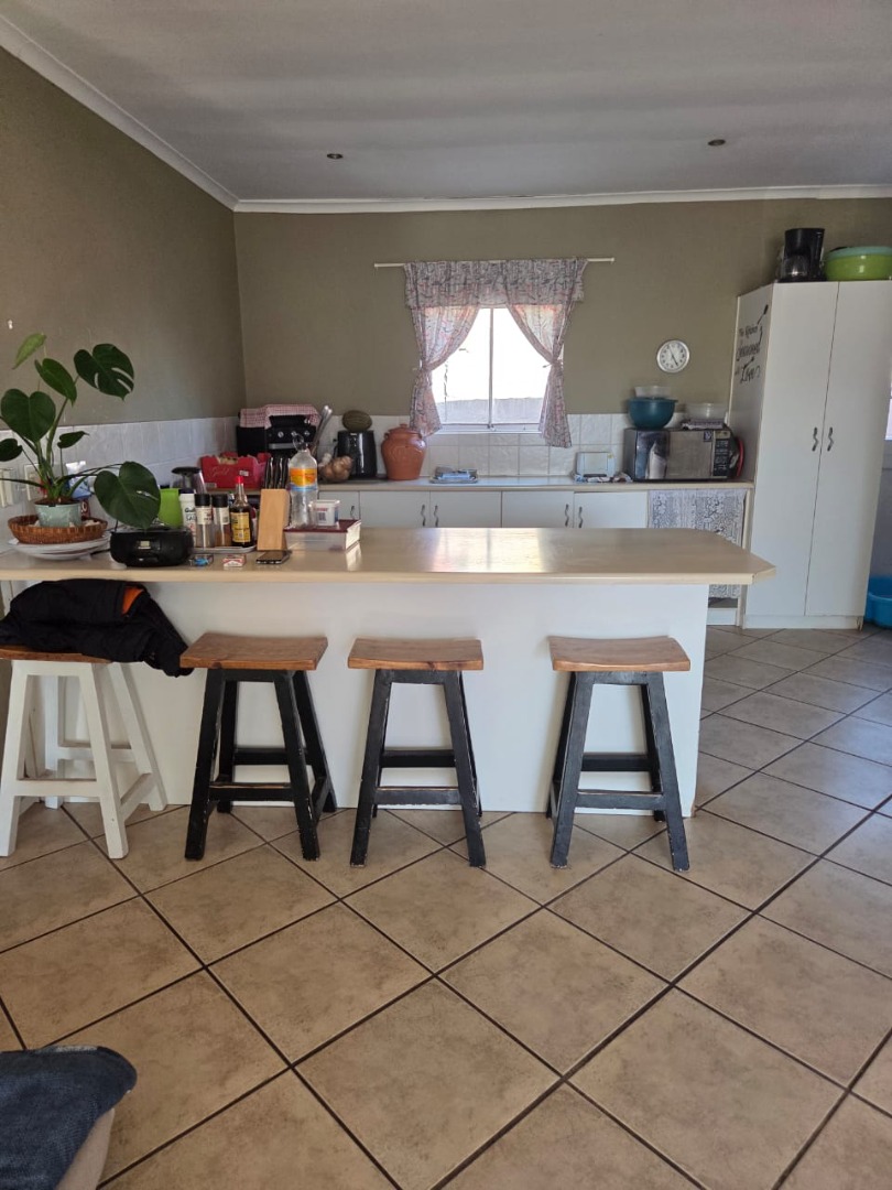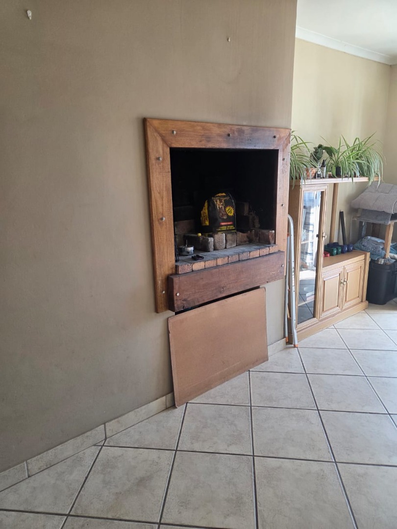 The kitchen is equipped with light-colored tiled flooring, ample white cabinetry, and a practical breakfast bar with seating, perfect for casual meals and daily living. An indoor braai area provides an ideal space for entertaining guests, adding to the home's appeal.