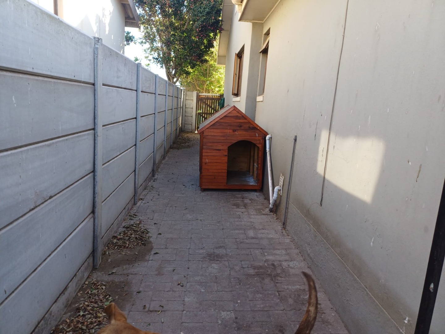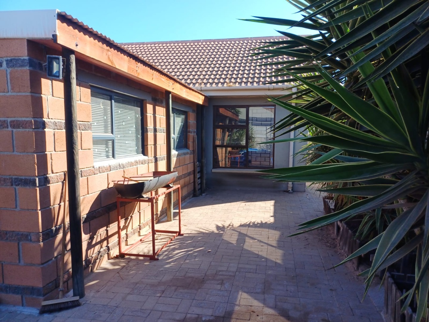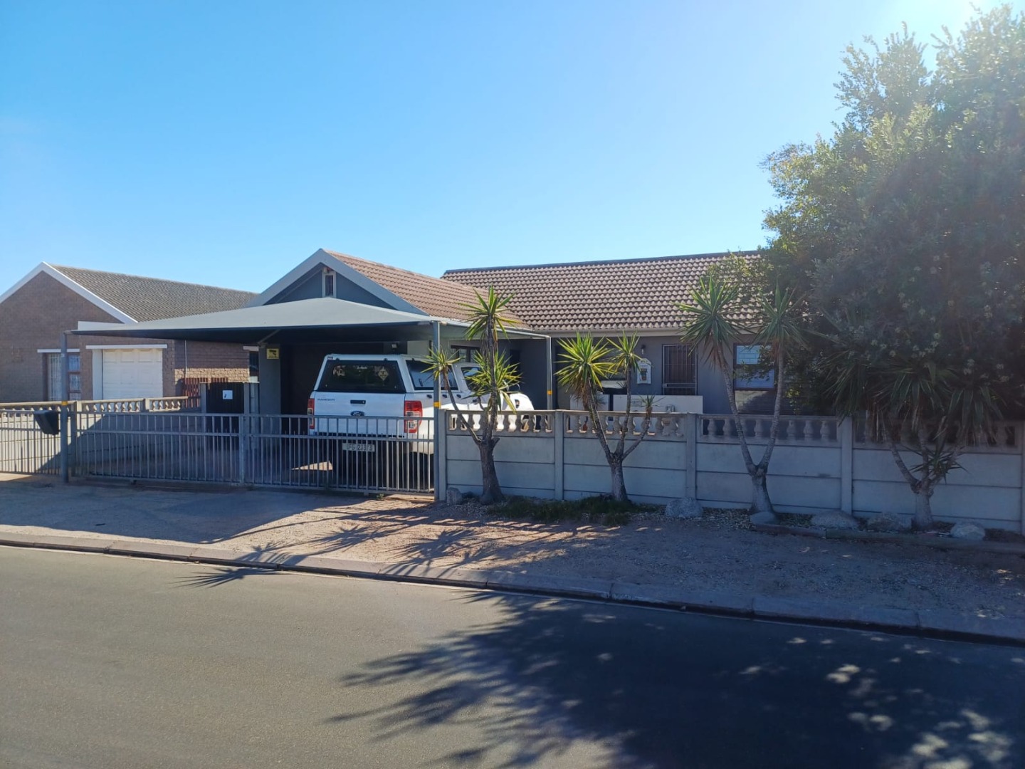 Enhanced security is evident with visible burglar bars and security gates, complemented by a solid concrete perimeter wall and an access gate, ensuring peace of mind for residents.