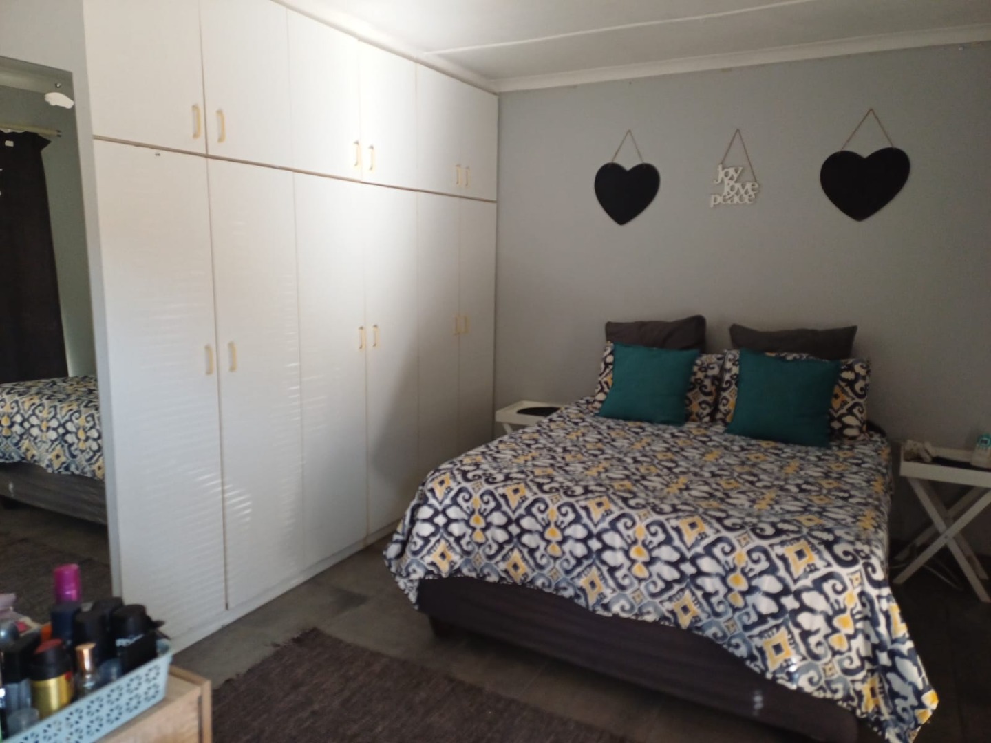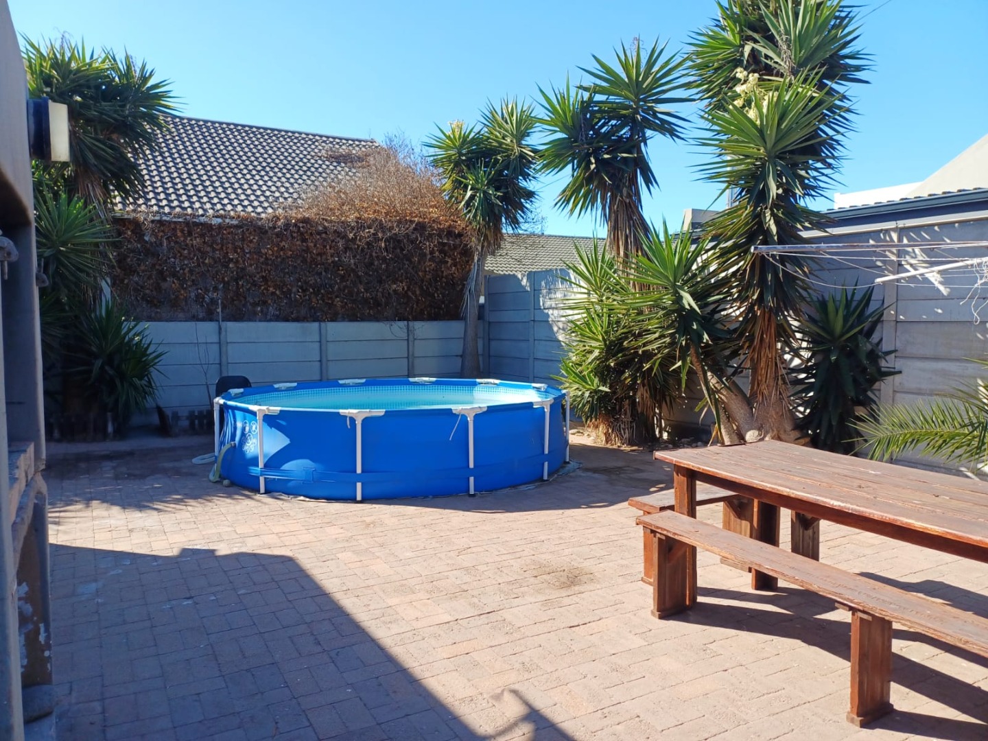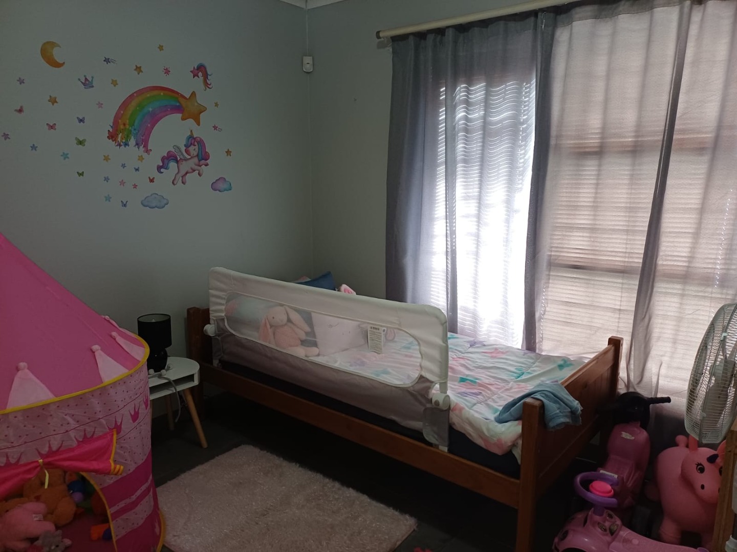 Enhanced security is evident with visible burglar bars and security gates, complemented by a solid concrete perimeter wall and an access gate, ensuring peace of mind for residents.