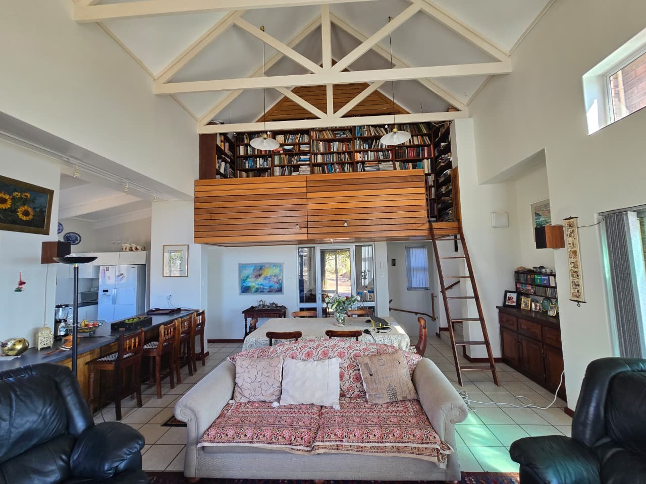 Spacious living room with indoor braai and loft library, double doors opening to a patio.