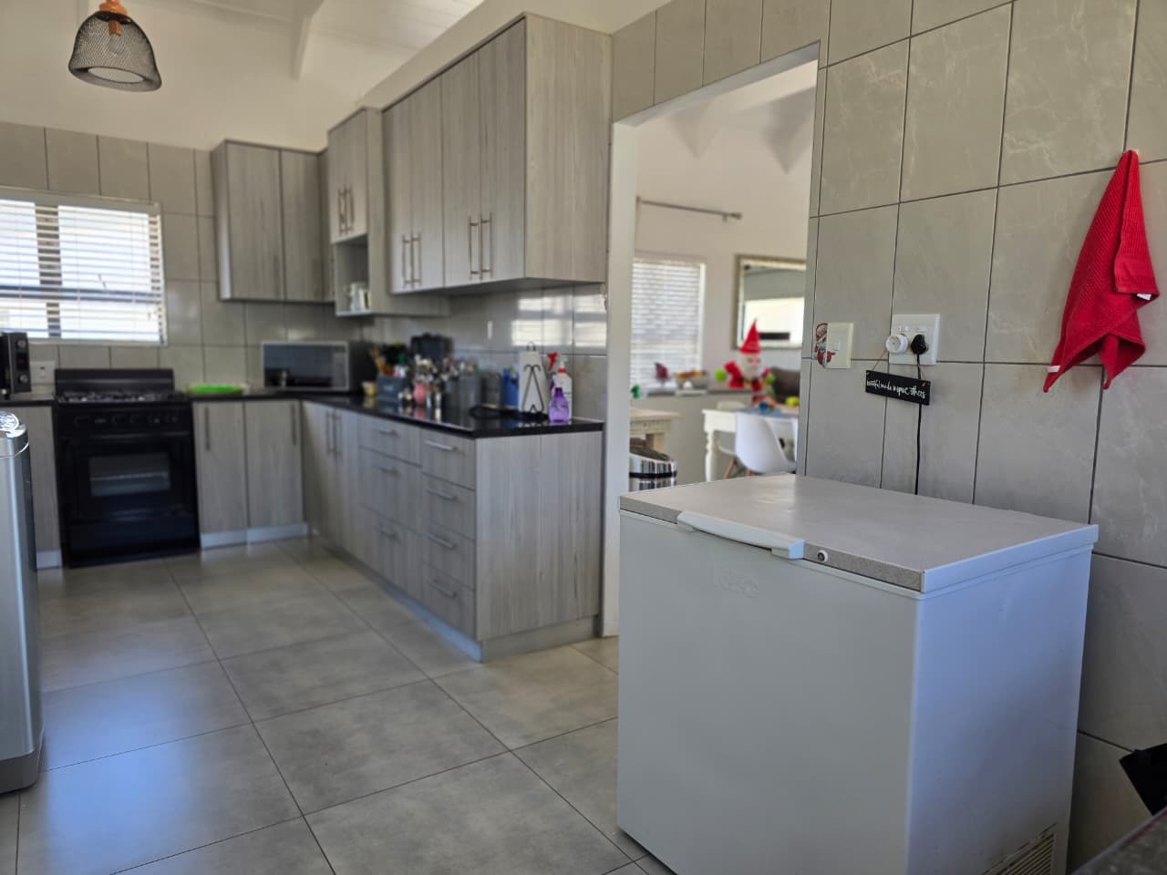 Spanning 220 sqm of floor space on a generous 750 sqm erf, this home features a well-designed interior. It comprises three comfortable bedrooms, including one with an en-suite bathroom, alongside a second full bathroom. The layout includes a dedicated lounge, a dining room, and a functional kitchen, ensuring ample space for daily living and entertaining. Sliding doors enhance the flow, connecting indoor spaces to the outdoors, where a built-in braai awaits for social gatherings.