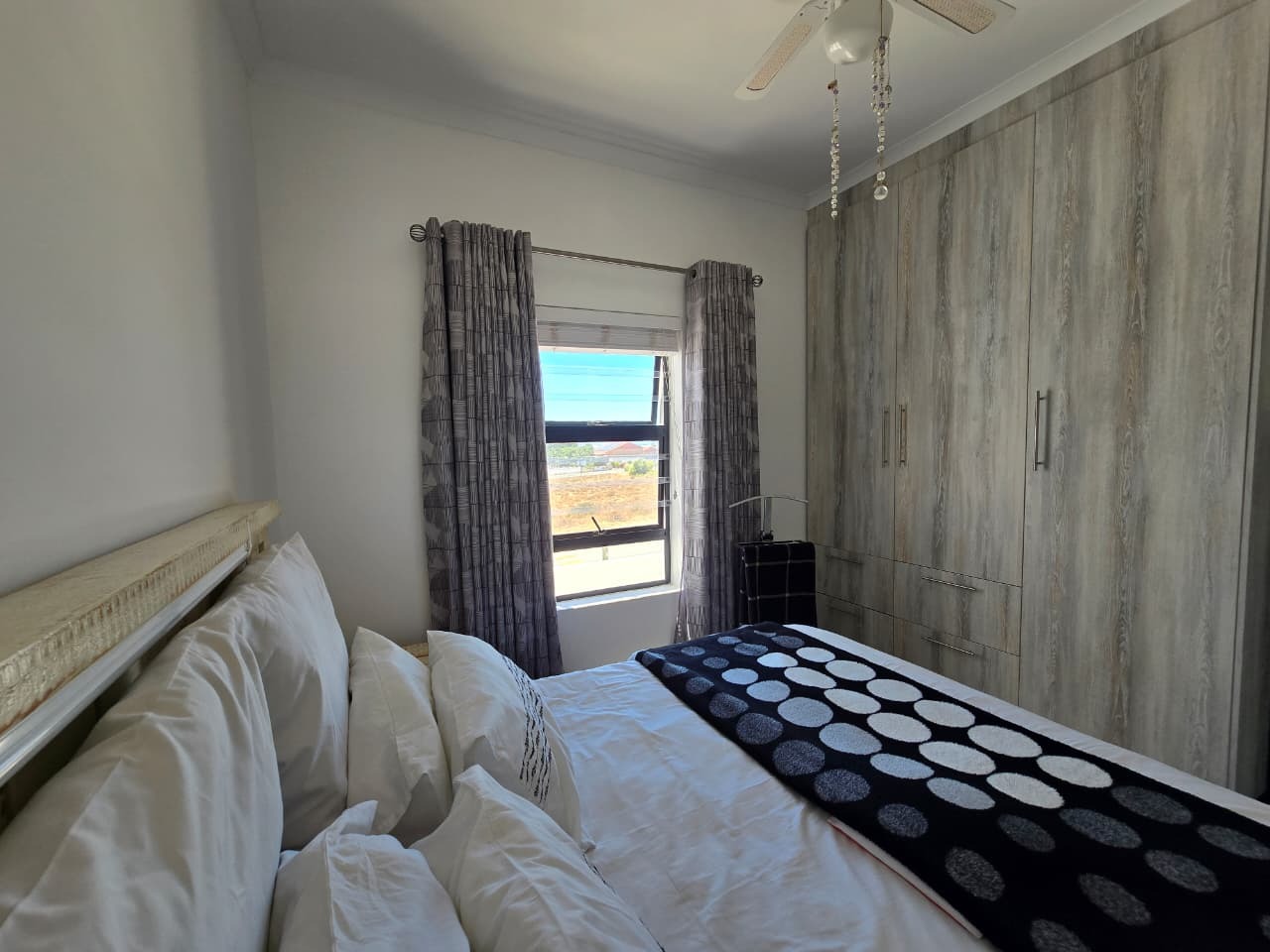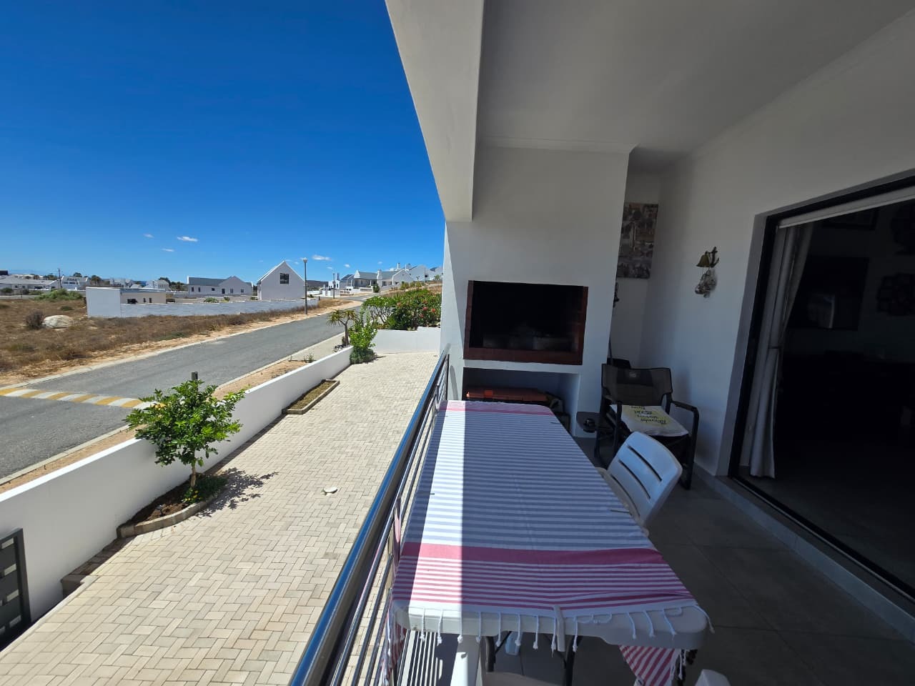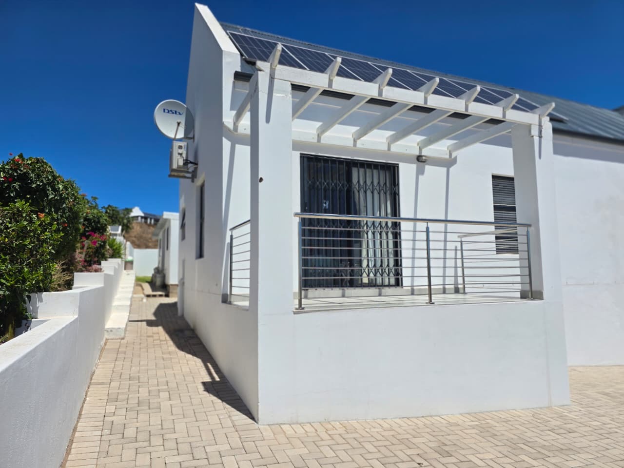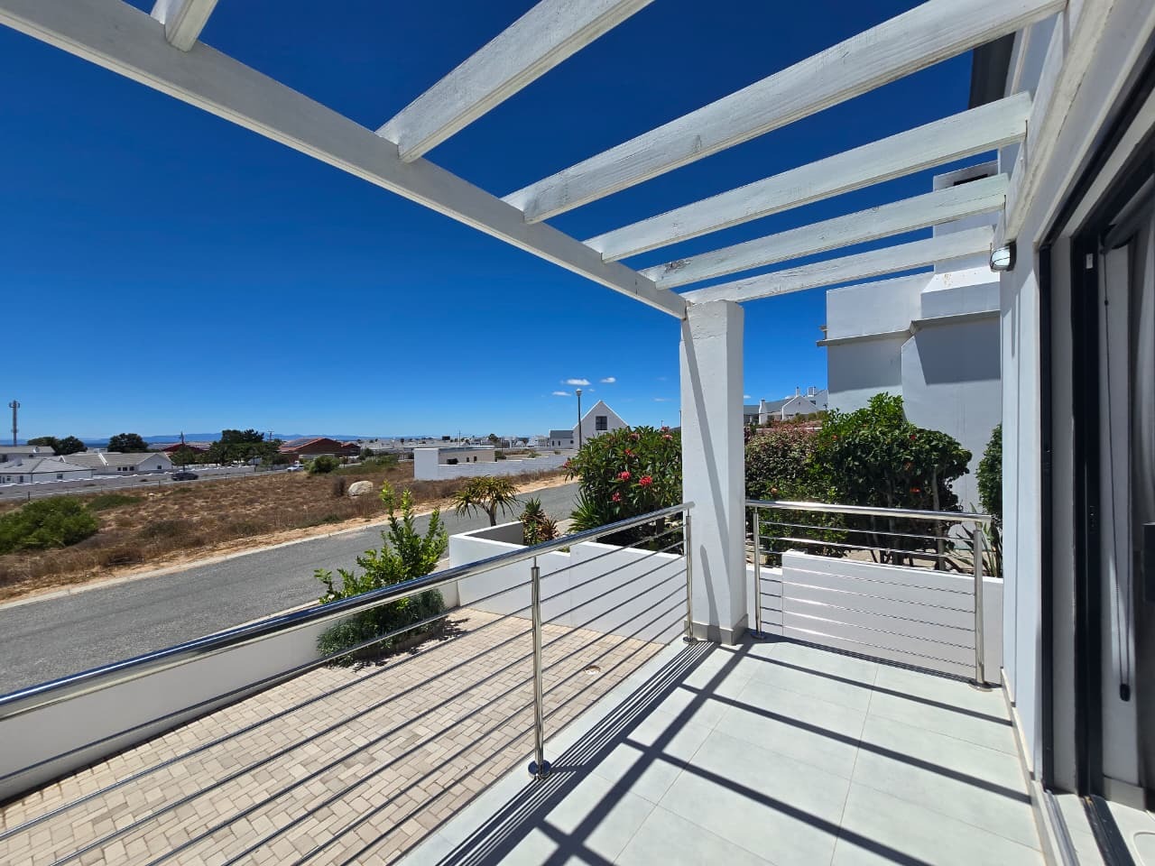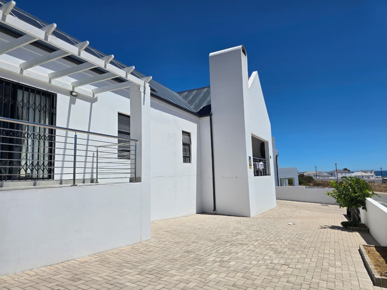 This modern residential property in Da Gama Bay, St Helena Bay, offers a contemporary lifestyle with an emphasis on efficiency and comfort. A paved driveway leads to convenient parking, while a balcony with a pergola provides an inviting outdoor space, enhancing the property's kerb appeal.