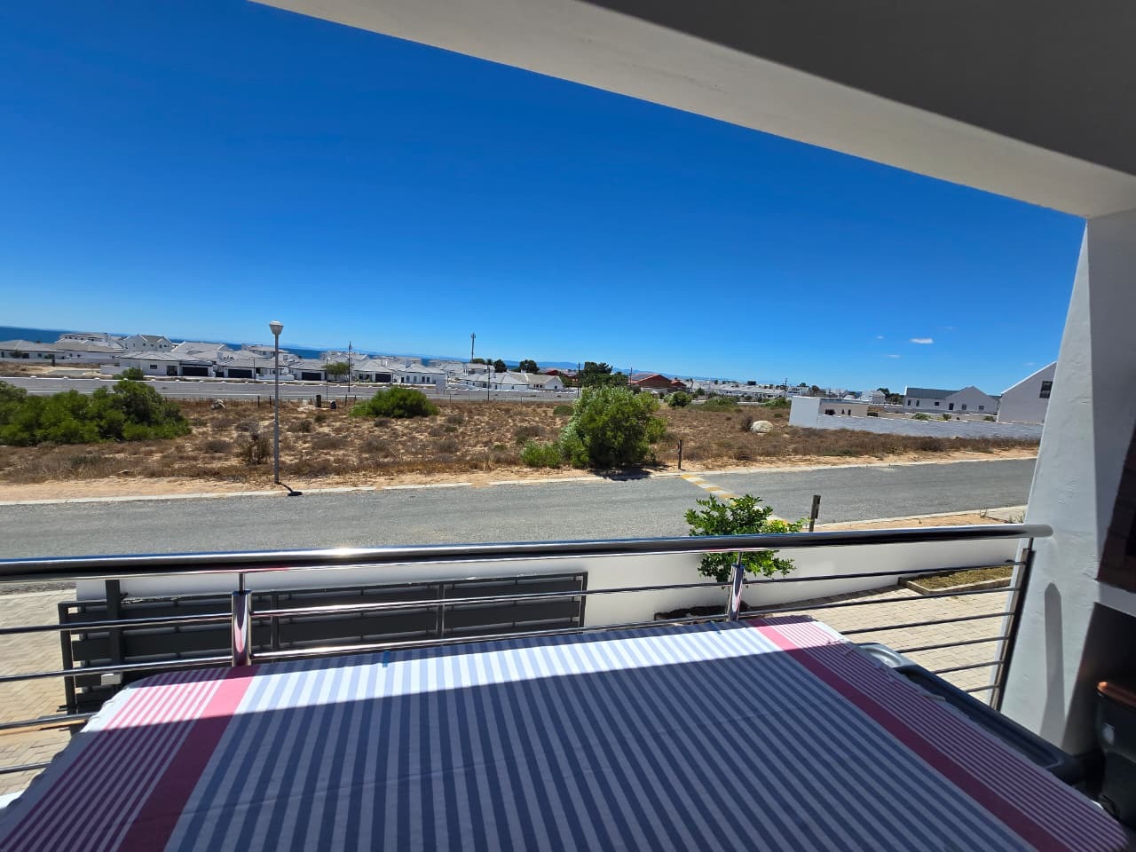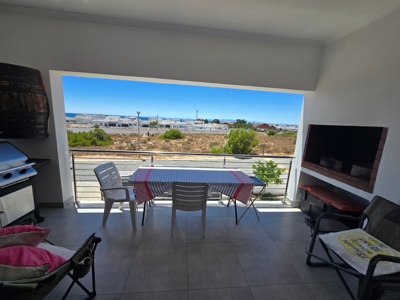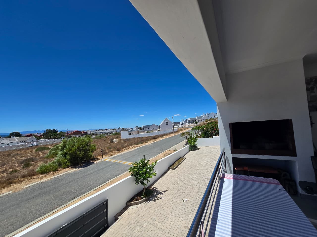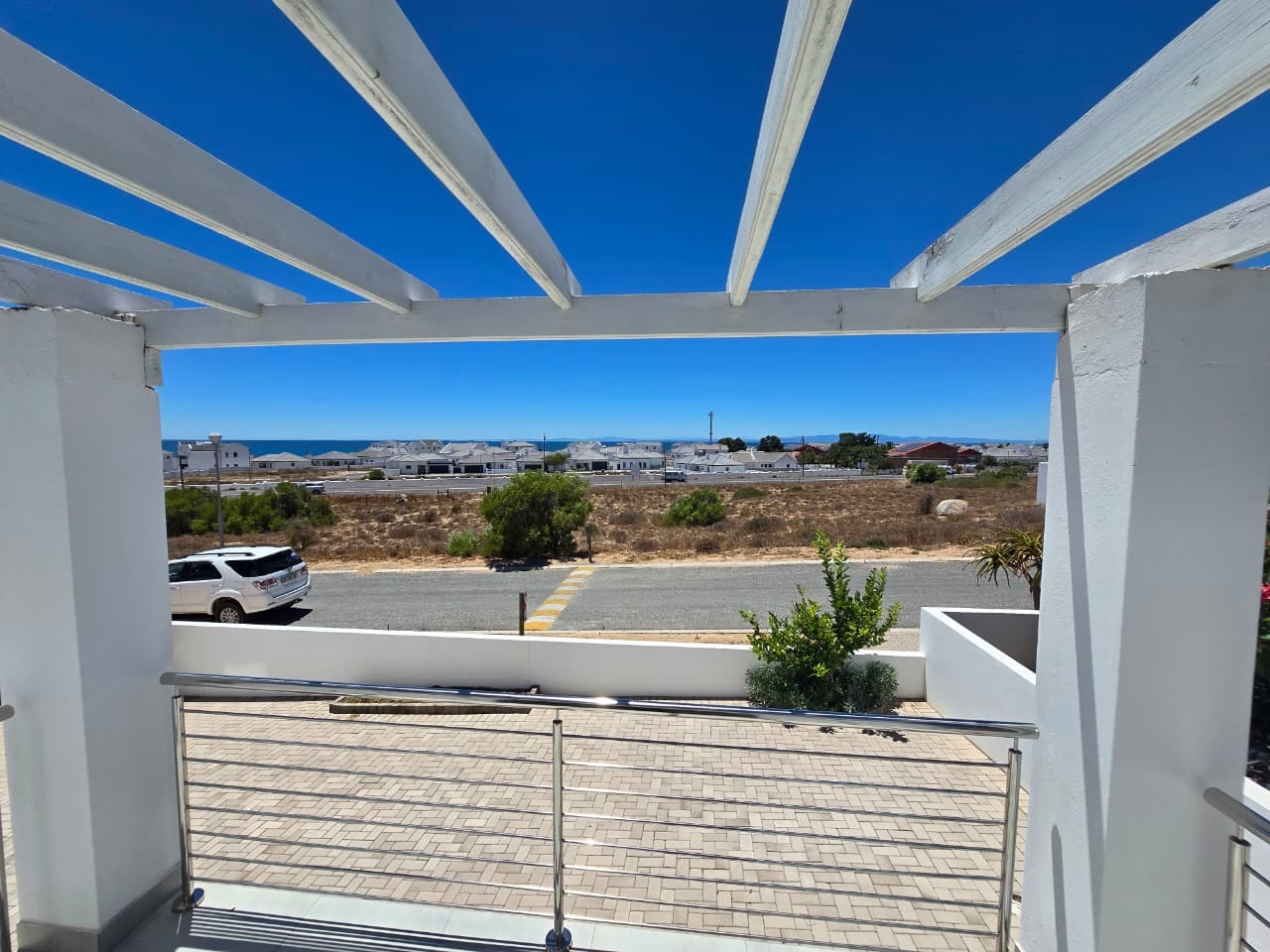 This modern residential property in Da Gama Bay, St Helena Bay, offers a contemporary lifestyle with an emphasis on efficiency and comfort. A paved driveway leads to convenient parking, while a balcony with a pergola provides an inviting outdoor space, enhancing the property's kerb appeal.