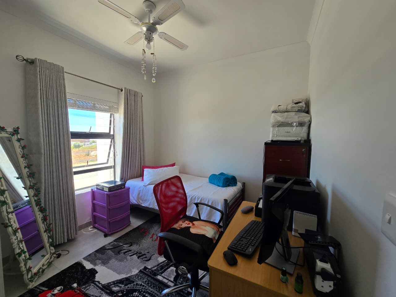 Spanning 220 sqm of floor space on a generous 750 sqm erf, this home features a well-designed interior. It comprises three comfortable bedrooms, including one with an en-suite bathroom, alongside a second full bathroom. The layout includes a dedicated lounge, a dining room, and a functional kitchen, ensuring ample space for daily living and entertaining. Sliding doors enhance the flow, connecting indoor spaces to the outdoors, where a built-in braai awaits for social gatherings.