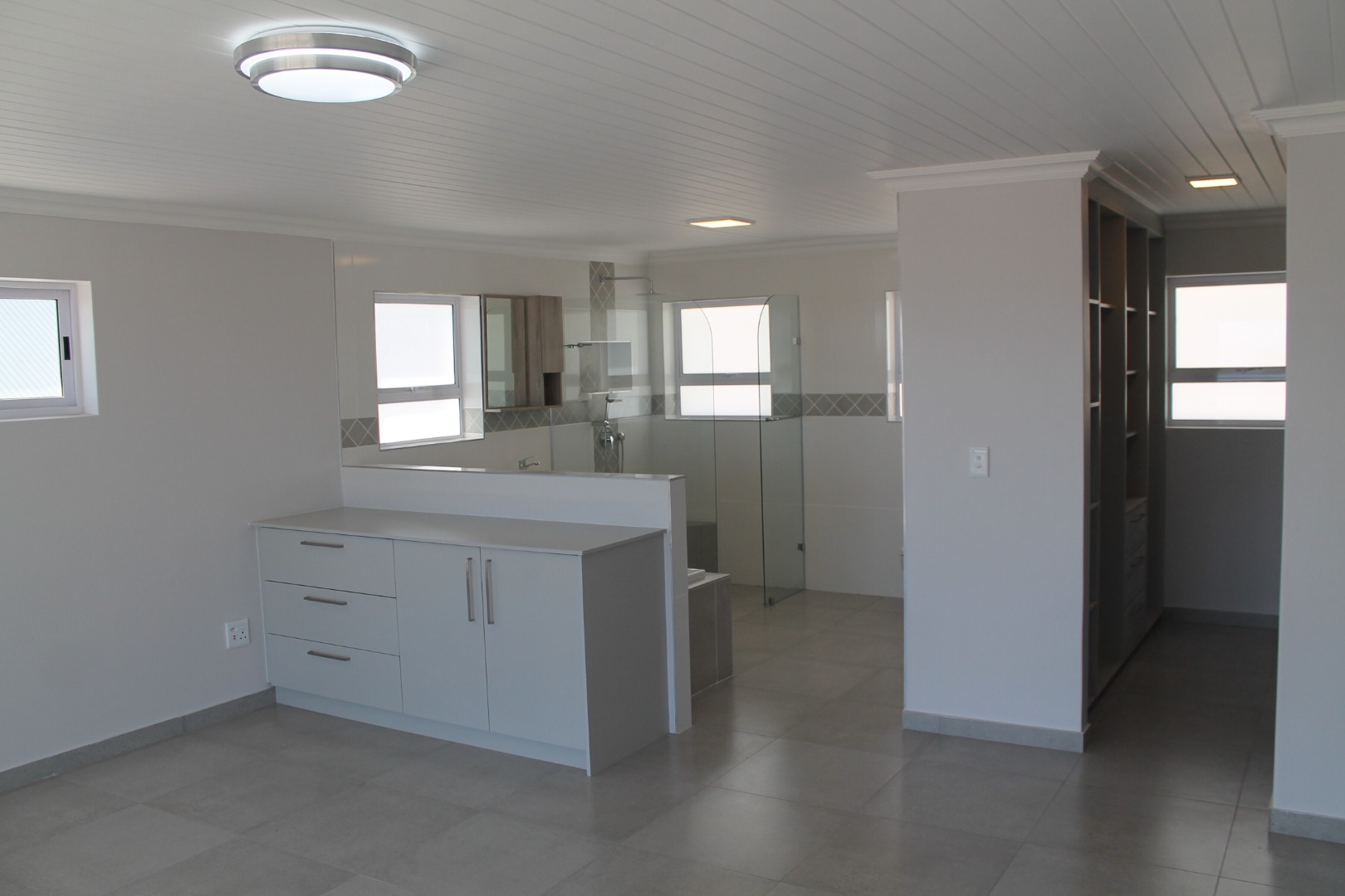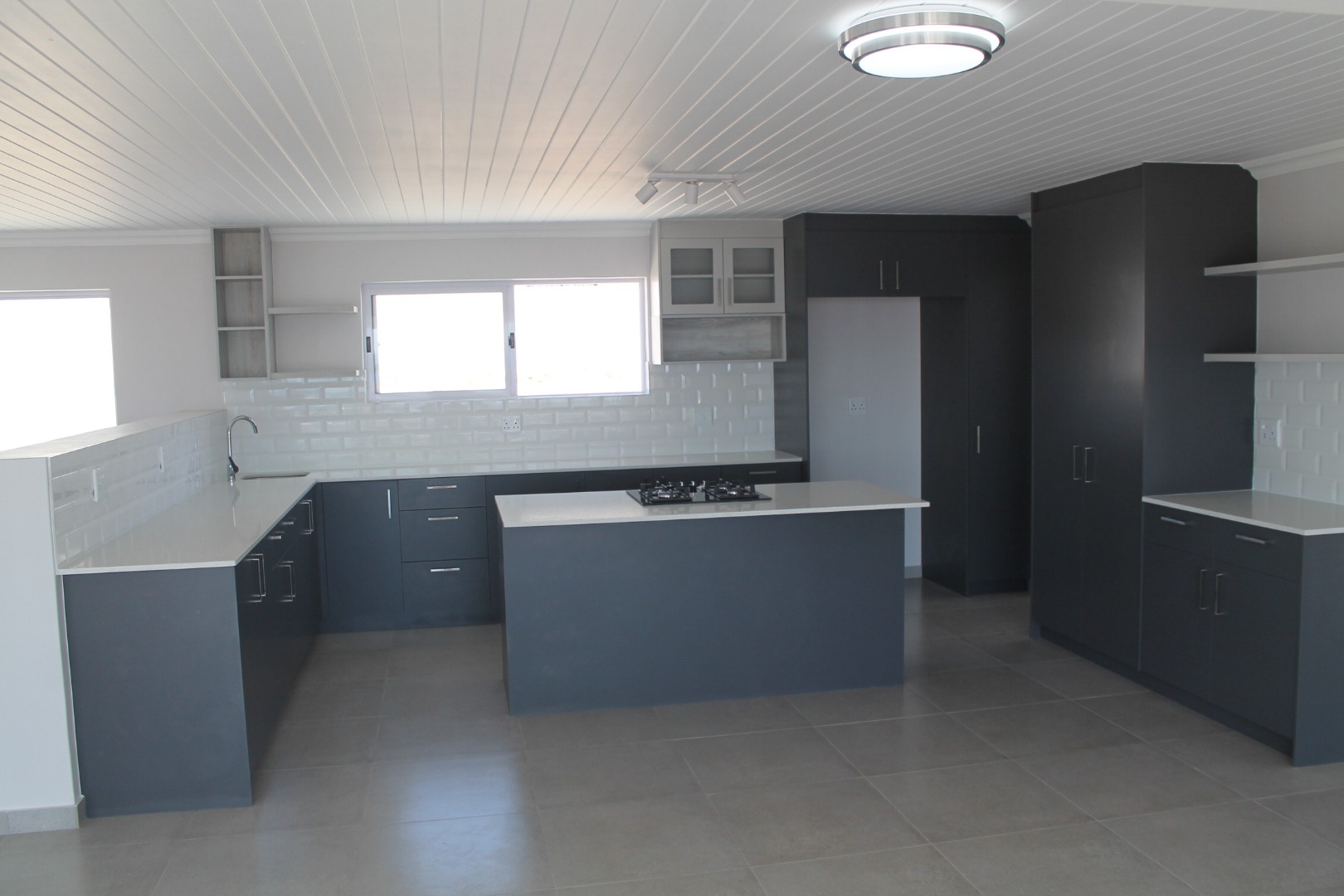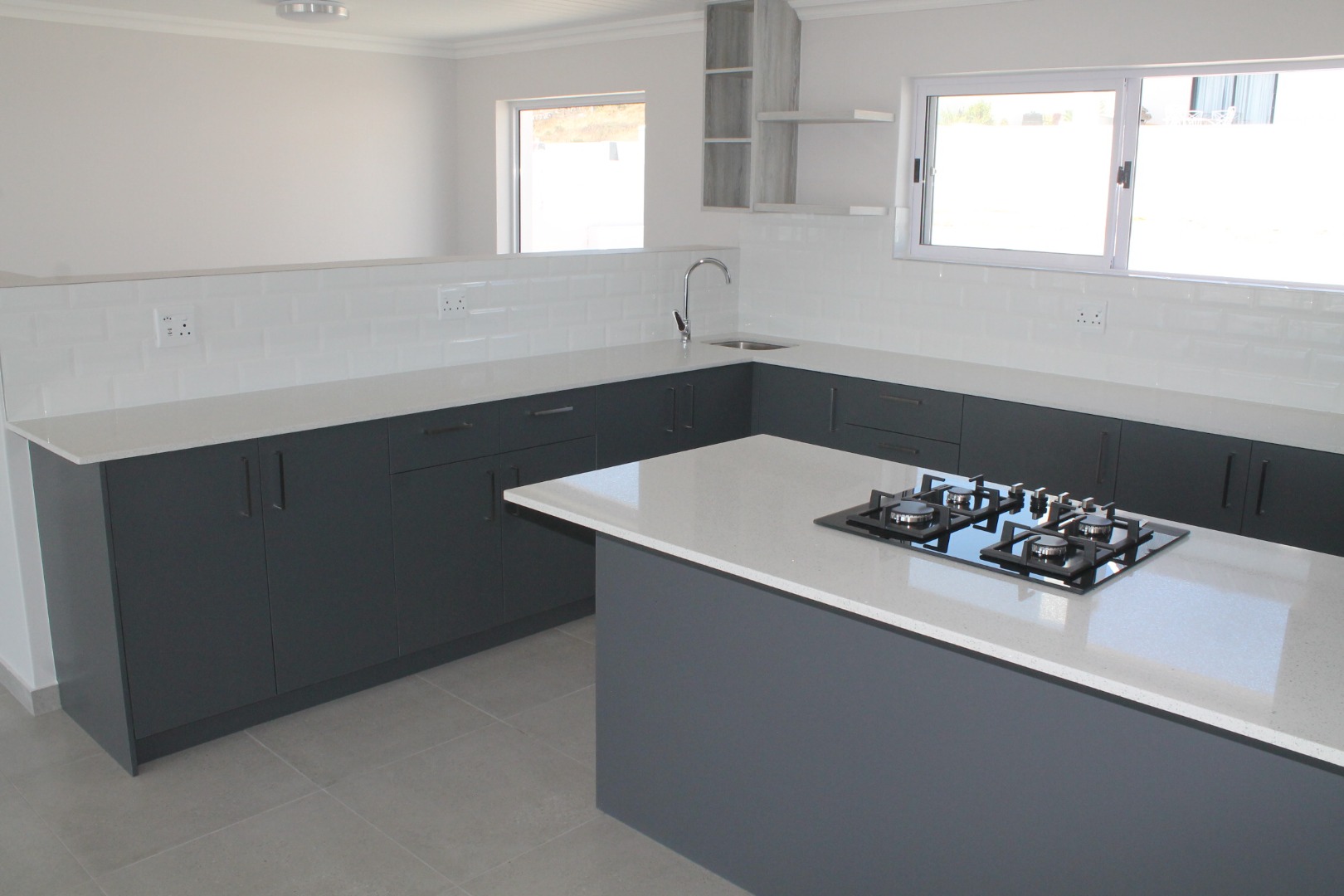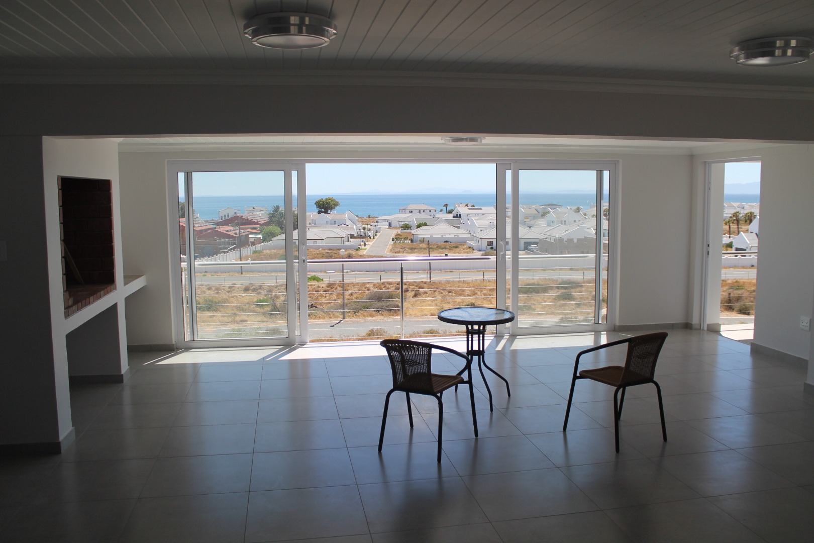 The stylish open-plan kitchen overlooks the dining and living areas and is fitted with a built-in oven, gas hob, central island, and a separate scullery. The living area features a built-in braai, making it perfect for year-round entertaining while soaking in the views.