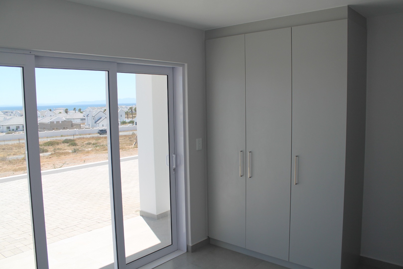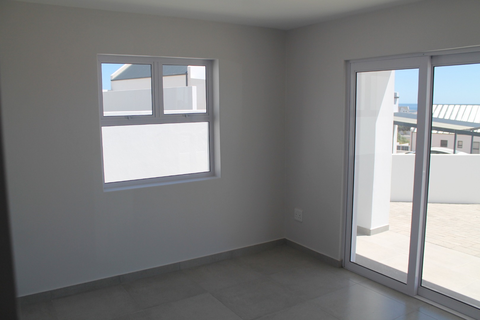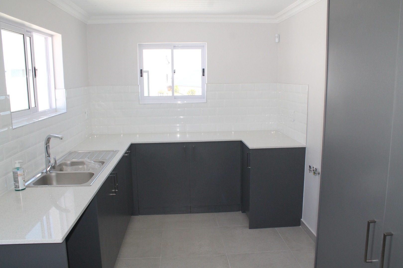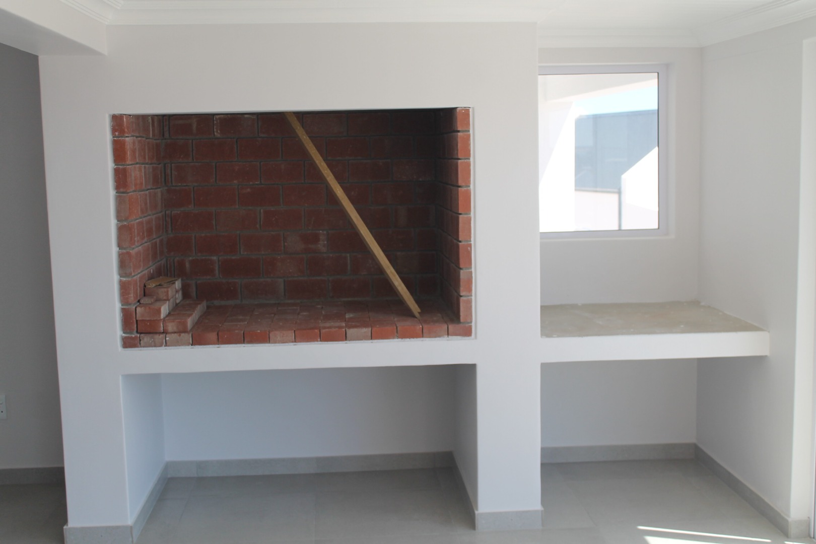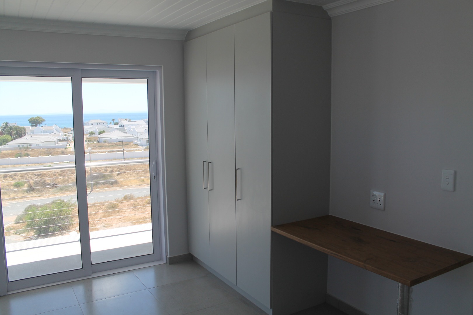 The stylish open-plan kitchen overlooks the dining and living areas and is fitted with a built-in oven, gas hob, central island, and a separate scullery. The living area features a built-in braai, making it perfect for year-round entertaining while soaking in the views.