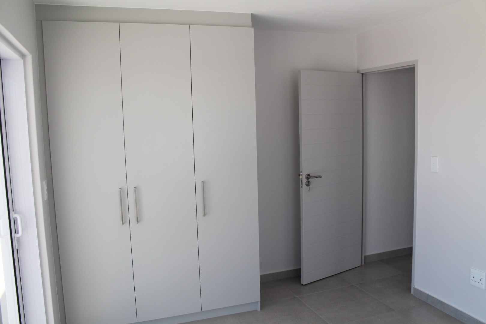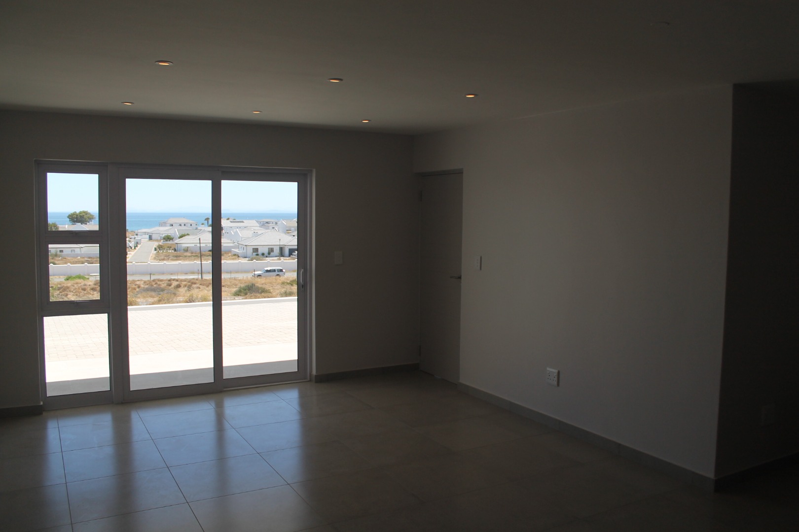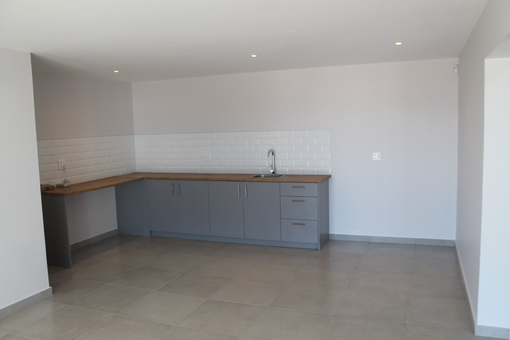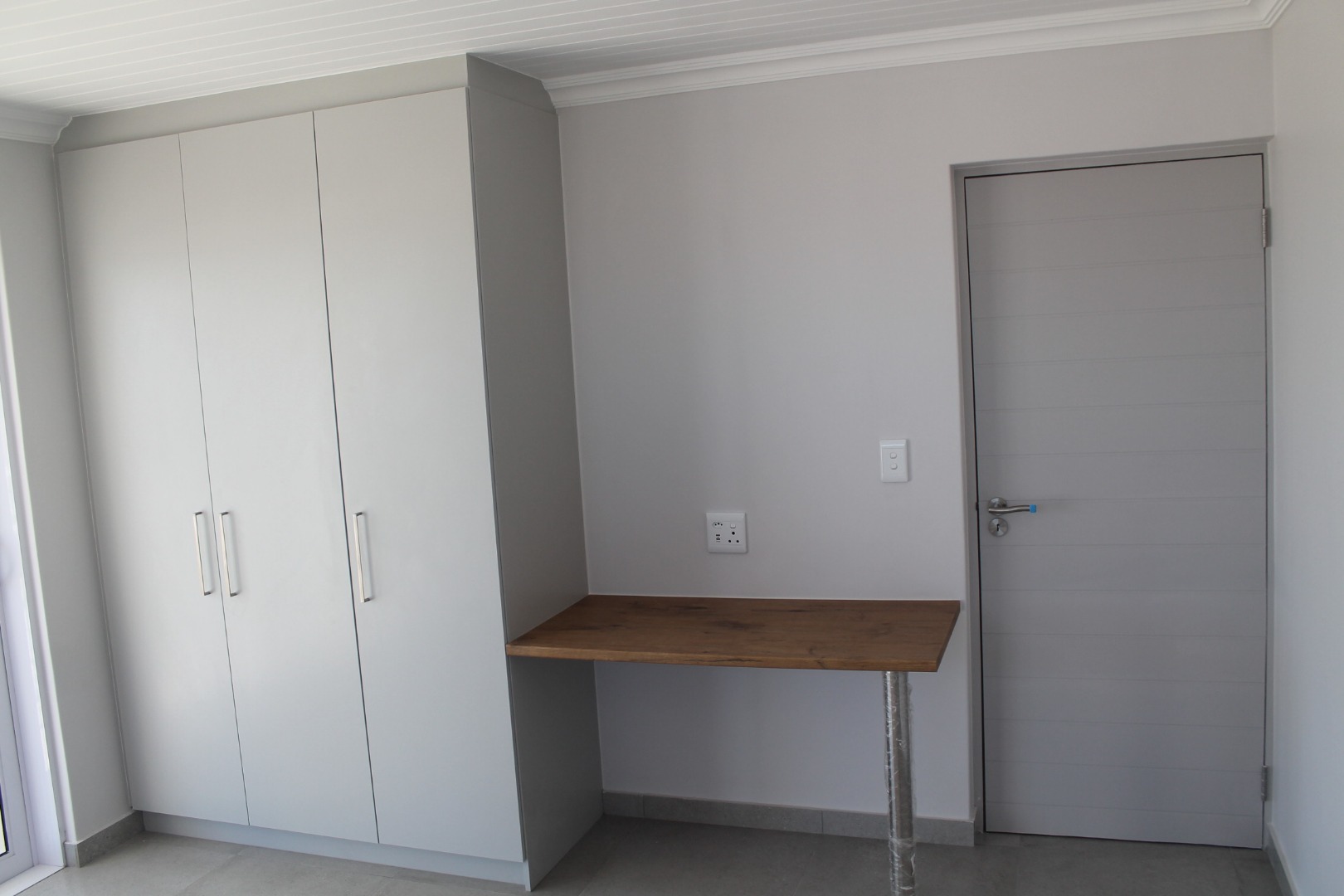 The stylish open-plan kitchen overlooks the dining and living areas and is fitted with a built-in oven, gas hob, central island, and a separate scullery. The living area features a built-in braai, making it perfect for year-round entertaining while soaking in the views.