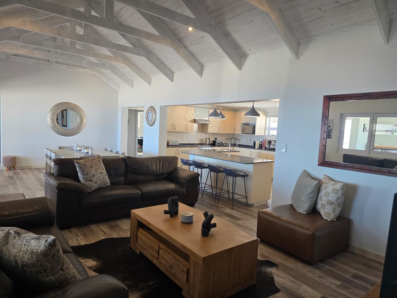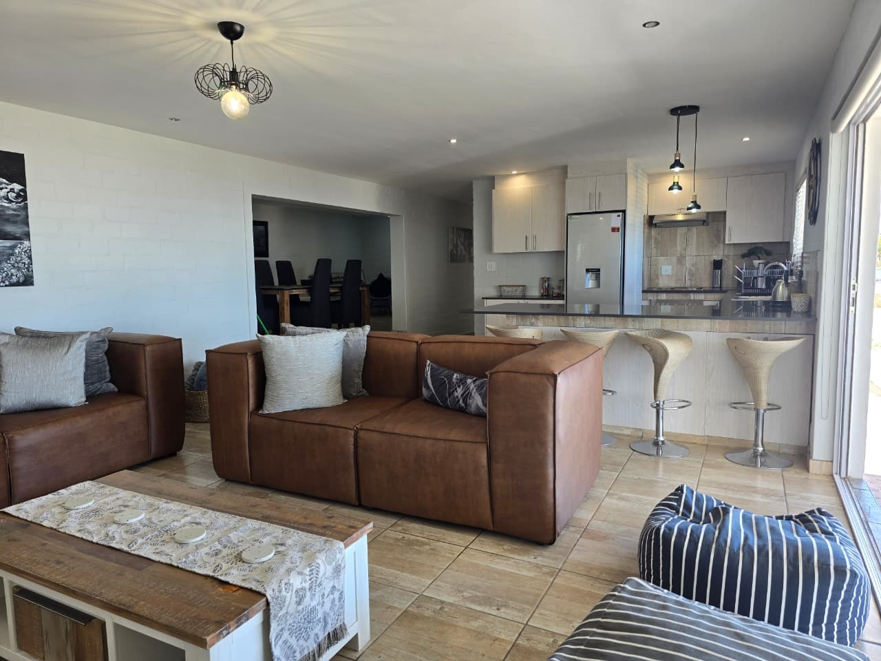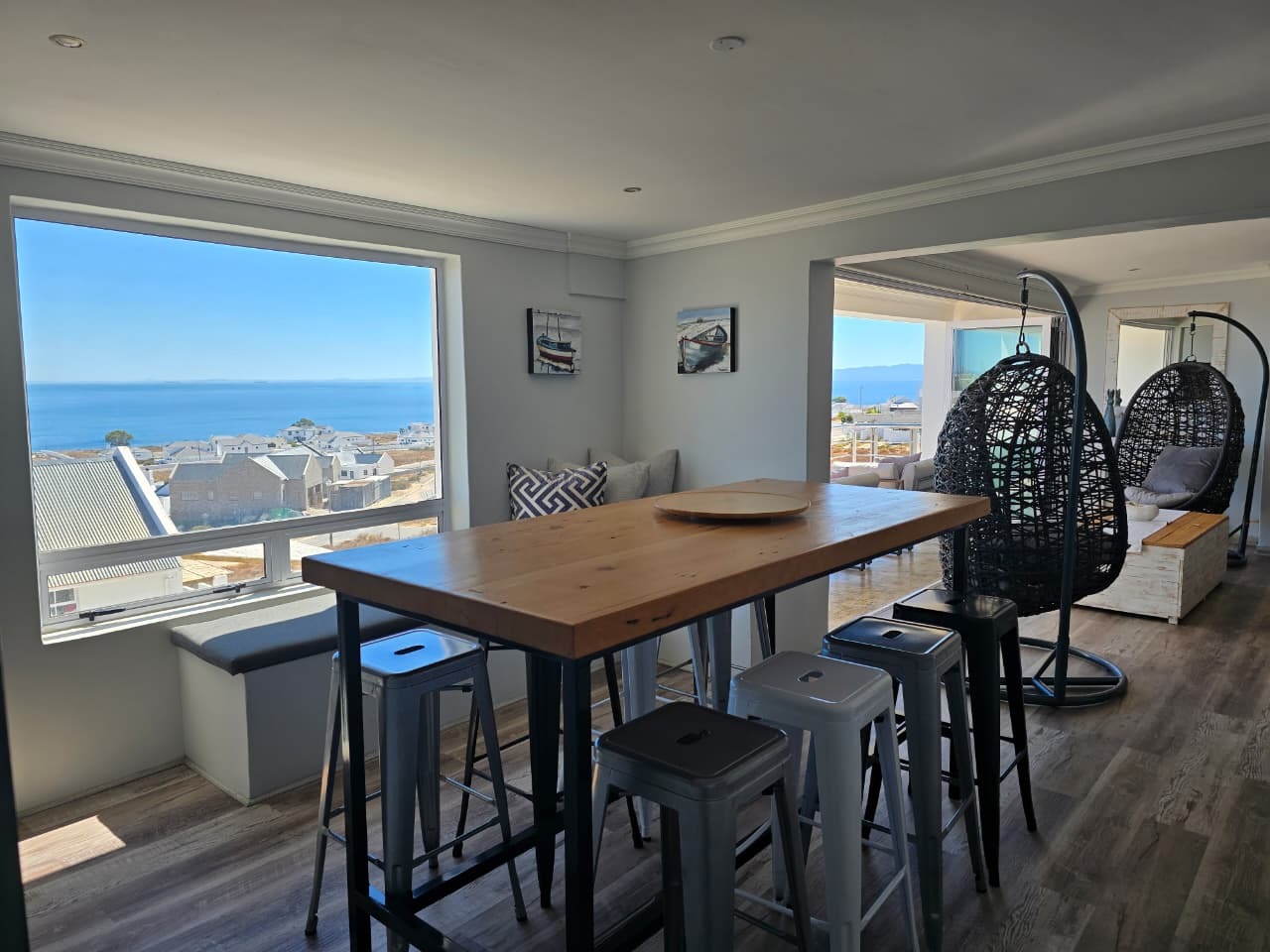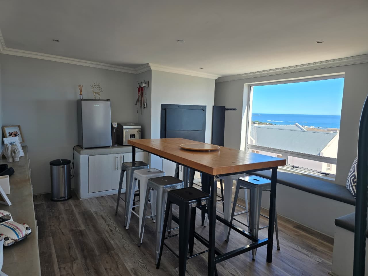 Indoor braai and bar area with built-in seating and sea views