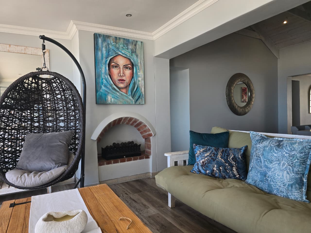 Lounge with fireplace opening onto a sea-facing balcony