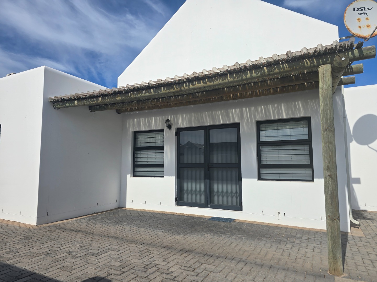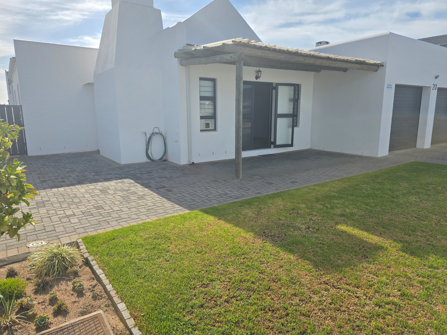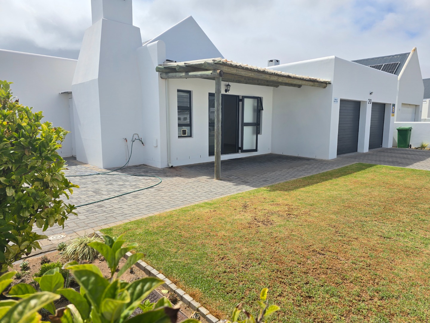 The kitchen and living space extend to an entertainment area with a built-in braai and fireplace, perfect for hosting guests year-round. A double garage with a paved driveway provides secure and convenient parking.