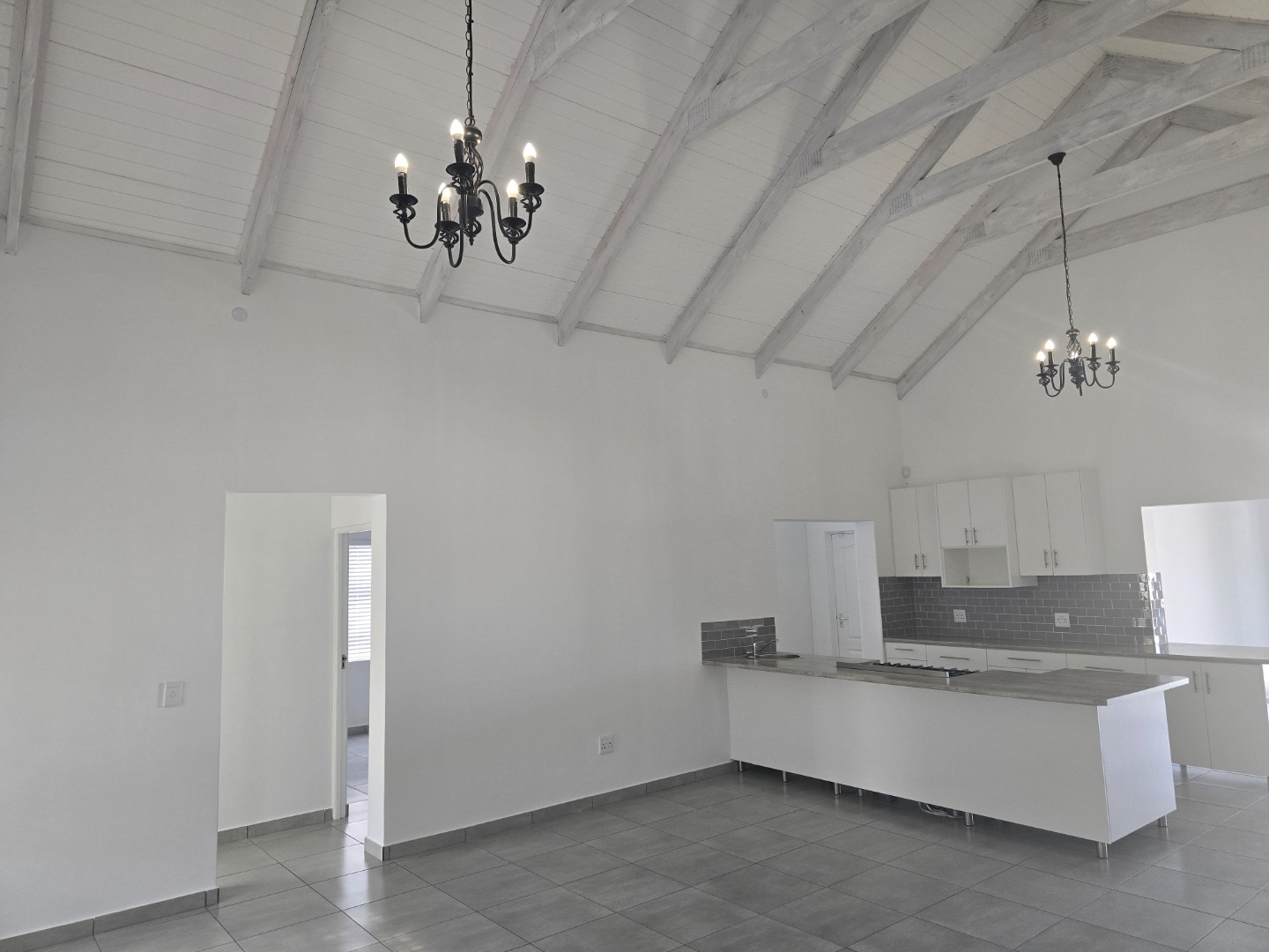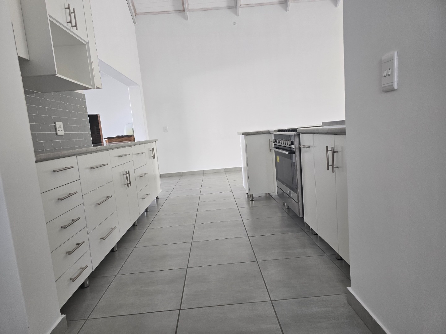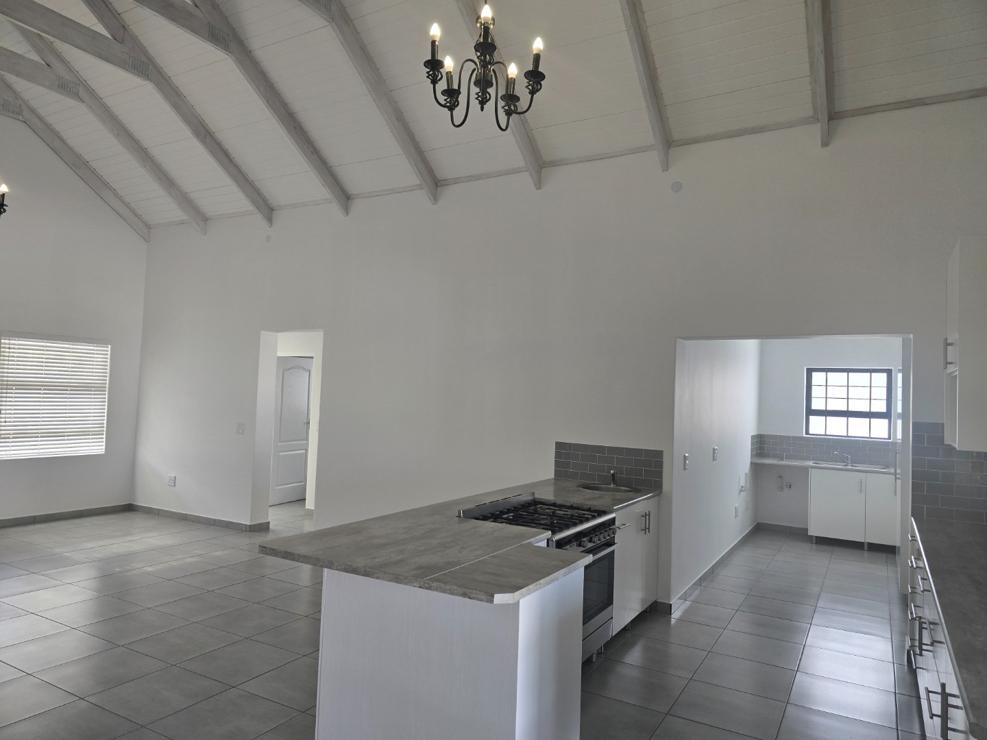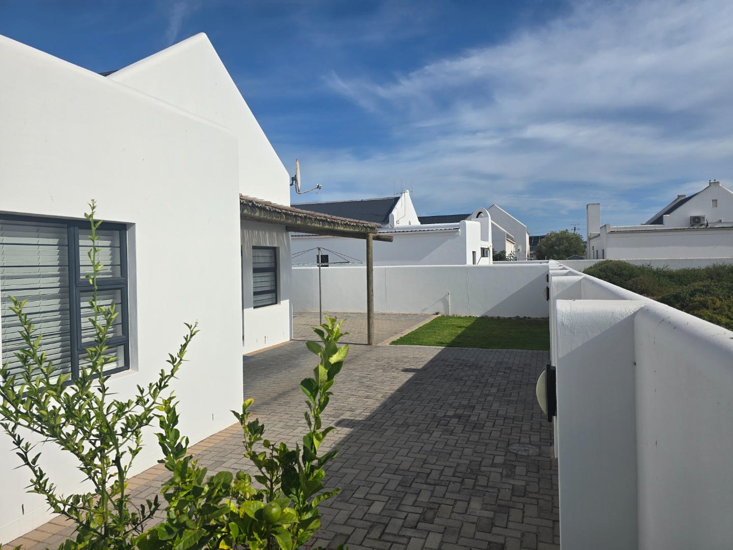 The kitchen and living space extend to an entertainment area with a built-in braai and fireplace, perfect for hosting guests year-round. A double garage with a paved driveway provides secure and convenient parking.
