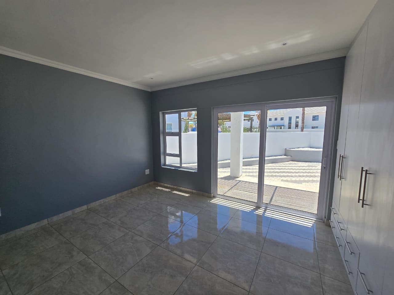Each bedroom room with build in cupboards, main bedroom with sliding doors with front view on patio.
