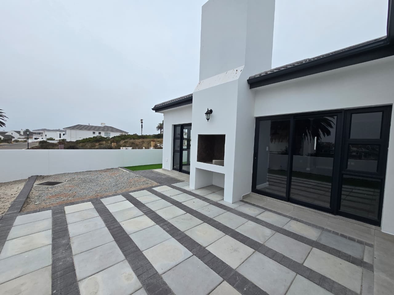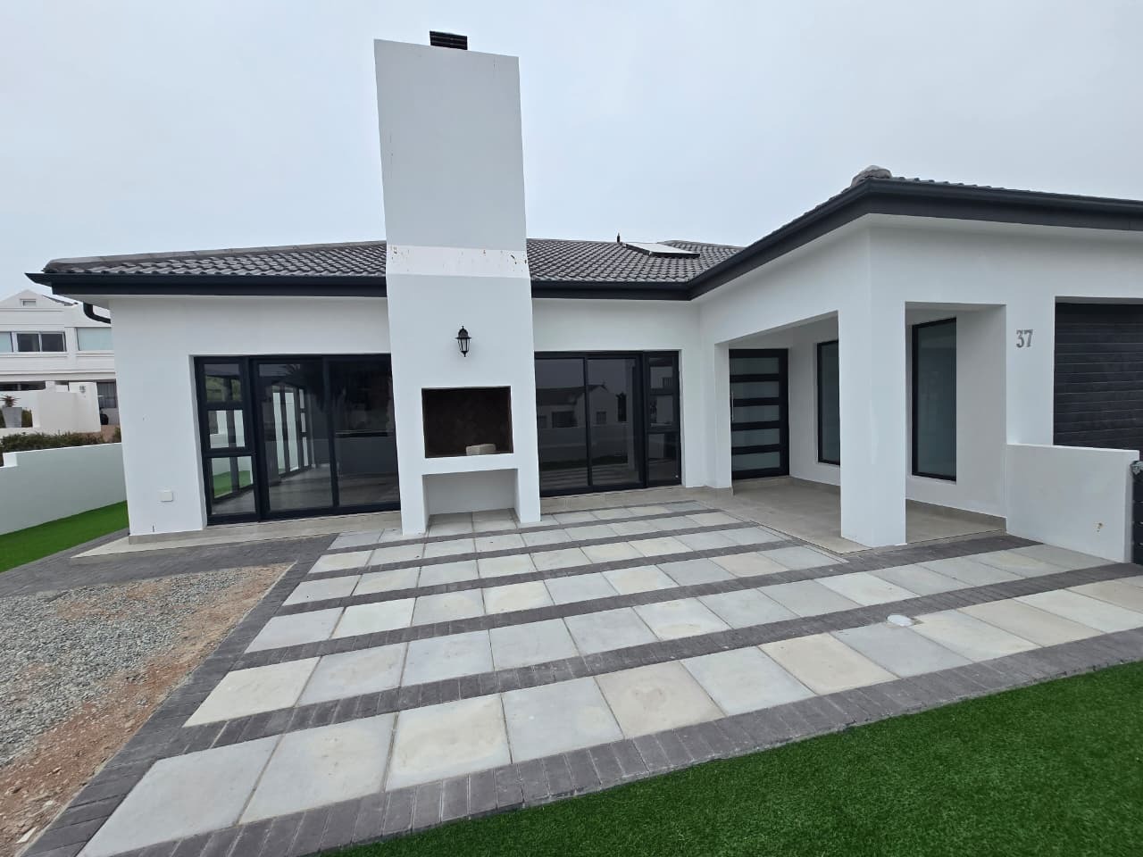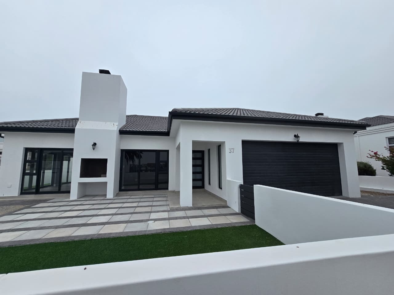 Discover modern coastal living in this contemporary home located within the Shelley Point Estate in St Helena Bay, South Africa. Boasting a pristine white exterior complemented by striking dark-framed windows and a dark roof, this property immediately impresses with its clean architectural lines. Large glass sliding doors enhance the modern aesthetic and promise natural light throughout the interior.