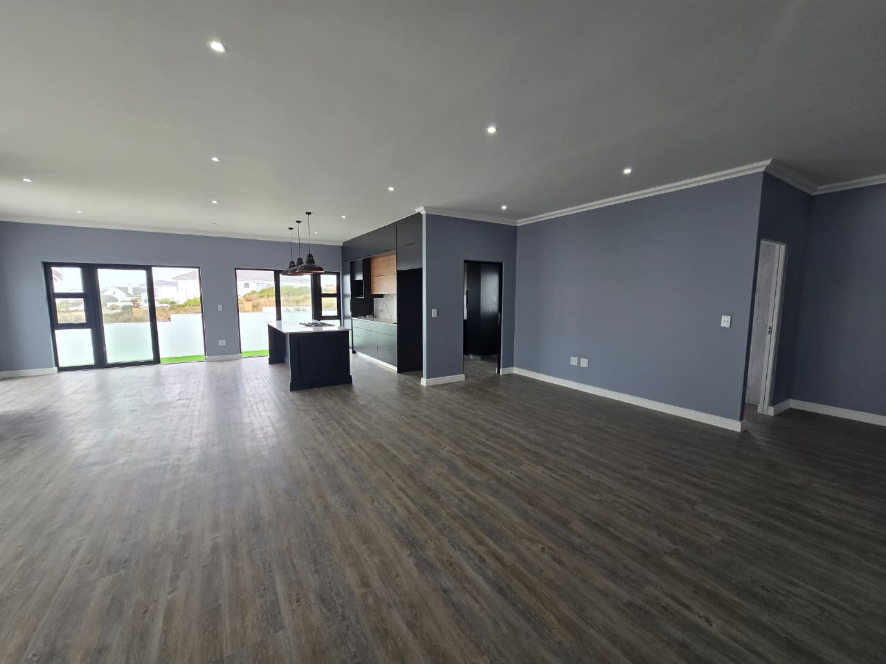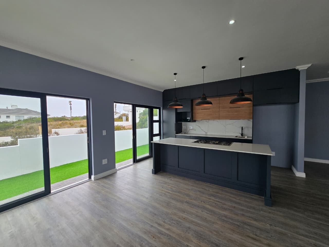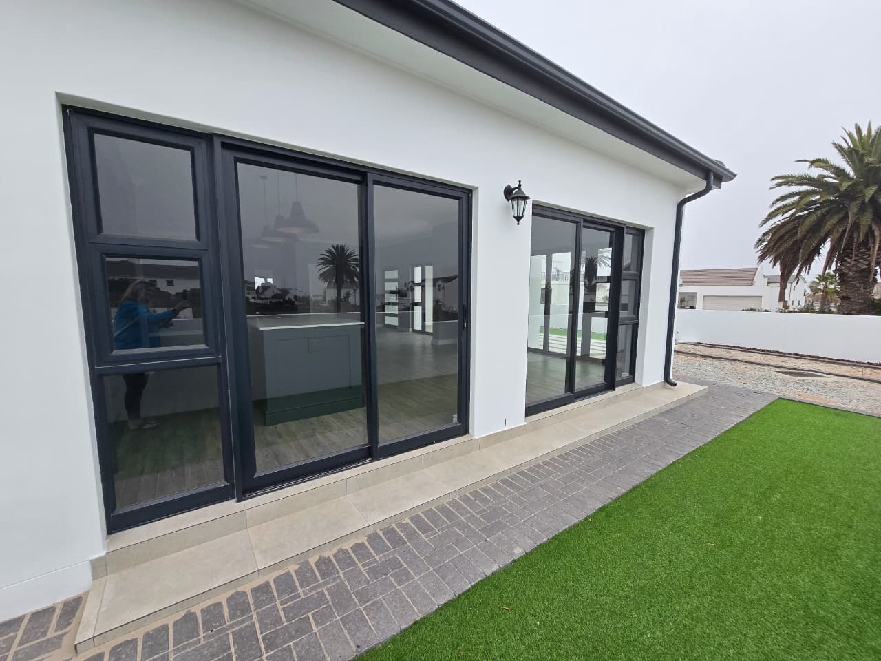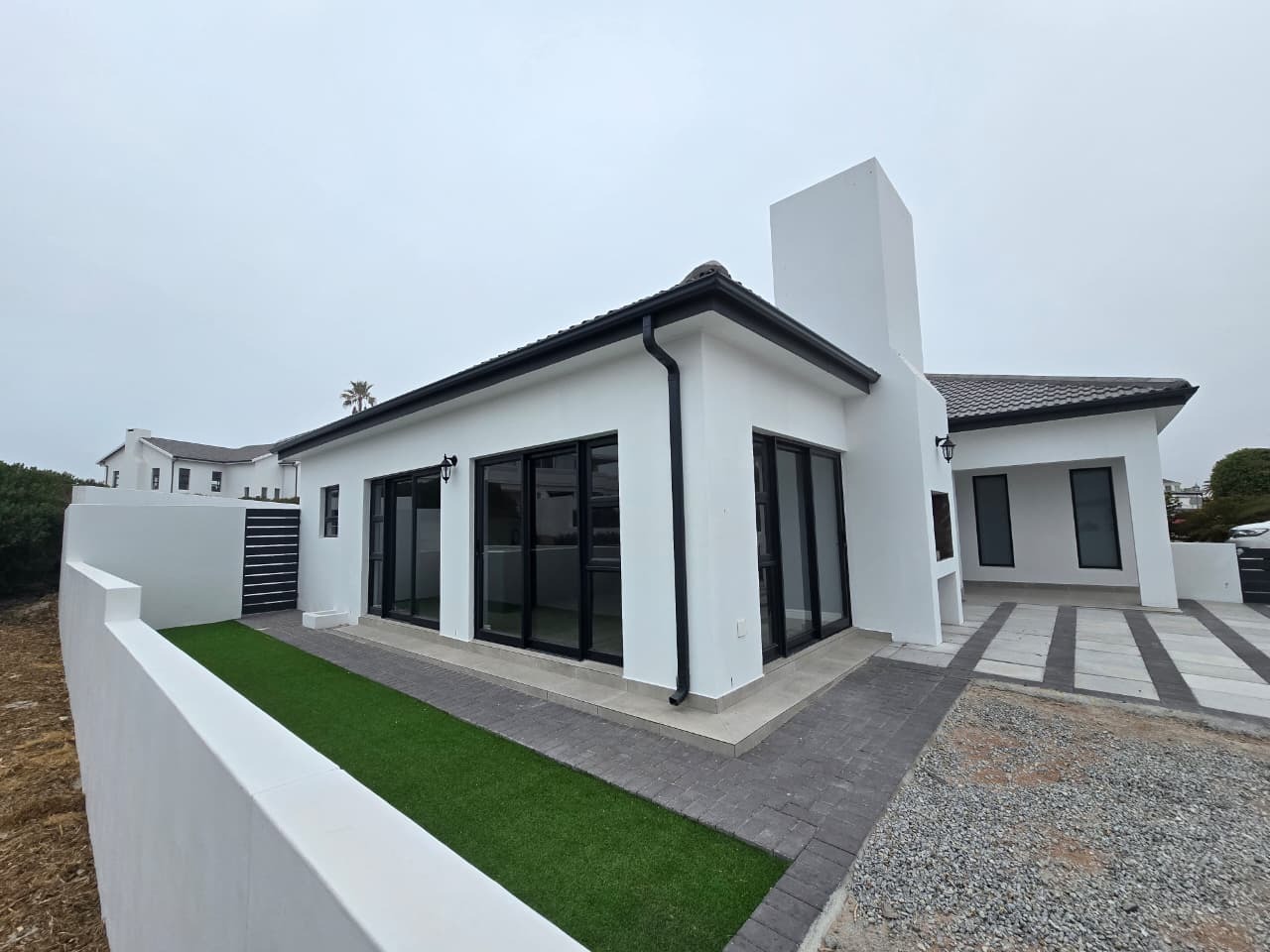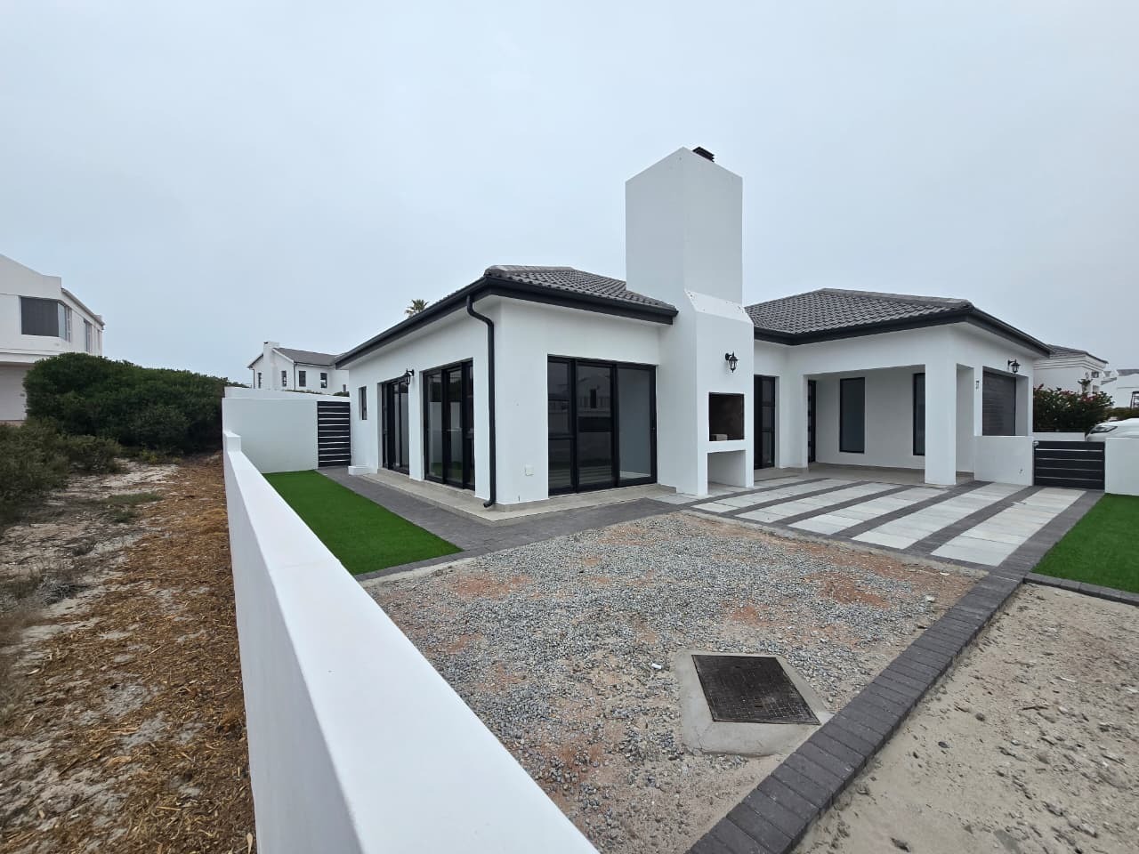 Discover modern coastal living in this contemporary home located within the Shelley Point Estate in St Helena Bay, South Africa. Boasting a pristine white exterior complemented by striking dark-framed windows and a dark roof, this property immediately impresses with its clean architectural lines. Large glass sliding doors enhance the modern aesthetic and promise natural light throughout the interior.