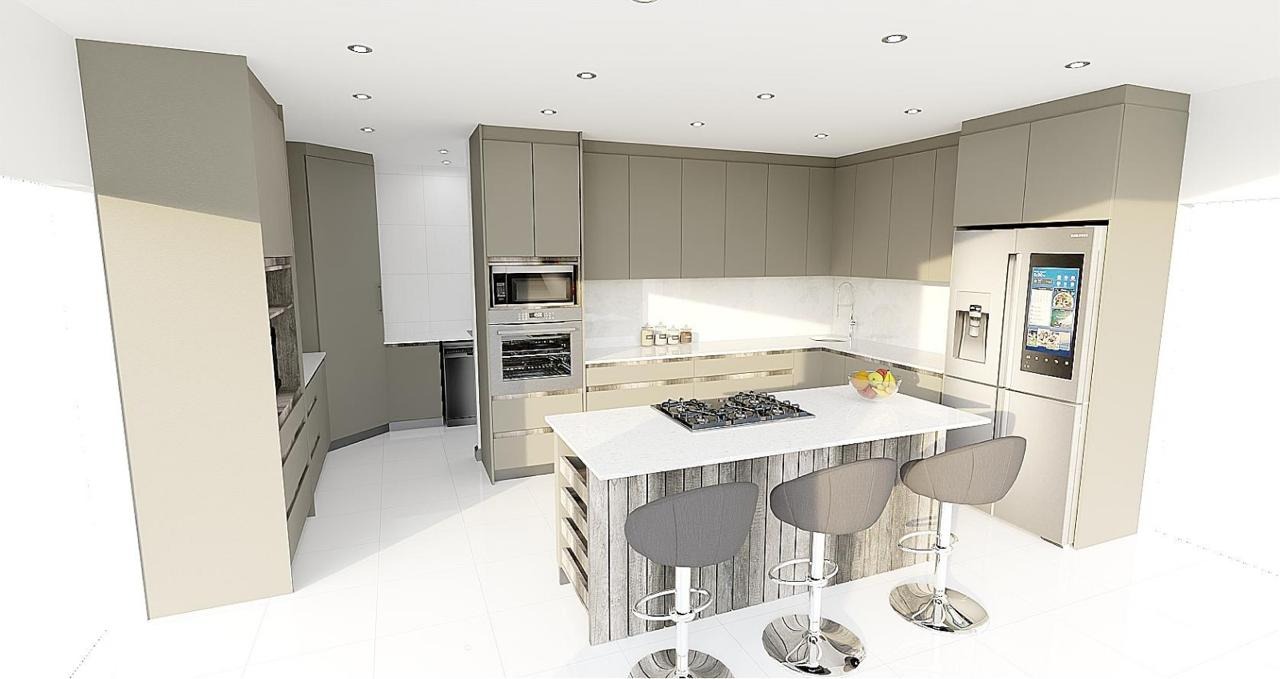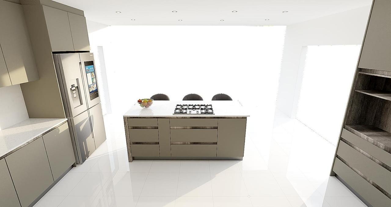 Modern open-plan kitchen with centre island, gas hob & prep bowl