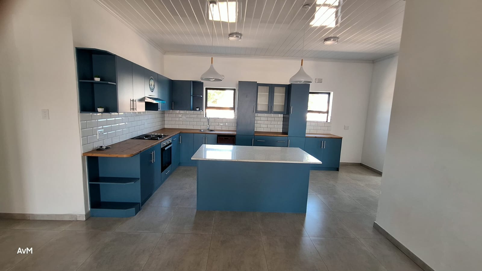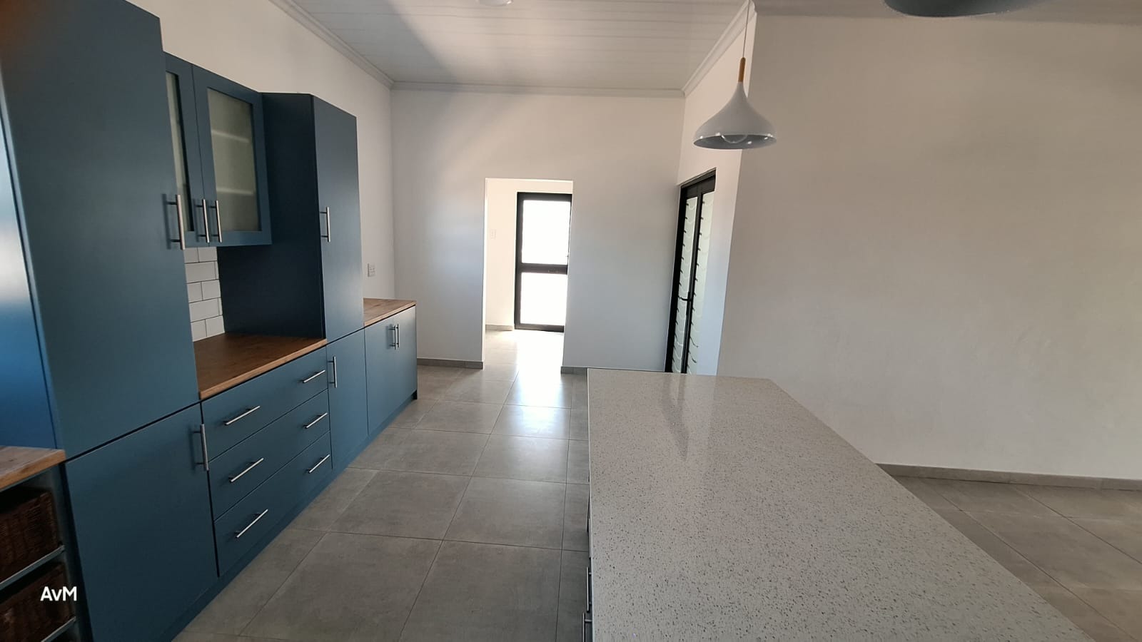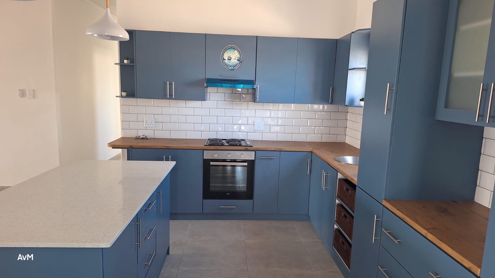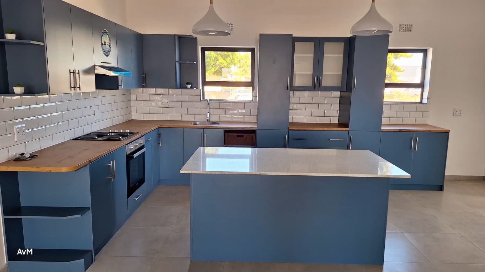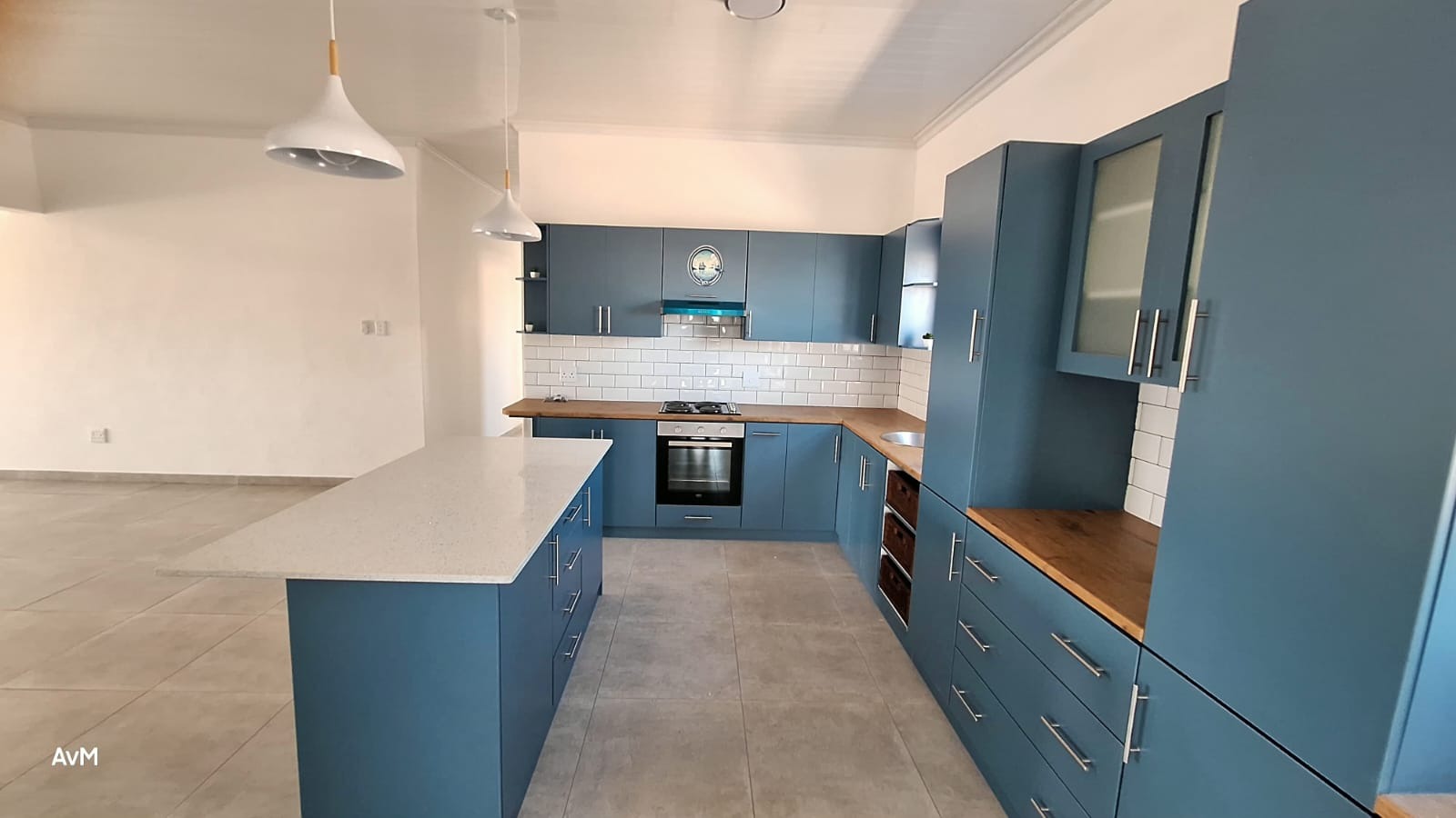 Step inside to an inviting open-plan layout, meticulously designed for contemporary living. The spacious lounge and dining areas flow seamlessly, characterized by fresh white walls and light grey tiled flooring that extends throughout the home, creating a bright and airy ambiance. The heart of this residence is the modern kitchen, a true highlight with its stylish blue cabinetry, crisp white subway tile backsplash, and warm wooden countertops. A functional kitchen island, featuring a contrasting light-colored surface, provides additional workspace and a central gathering point. The kitchen is equipped with new built-in appliances, including an oven, hob, and extractor fan, ensuring a delightful culinary experience. Ample storage solutions contribute to a clutter-free environment, while contemporary pendant lighting adds a touch of sophistication.