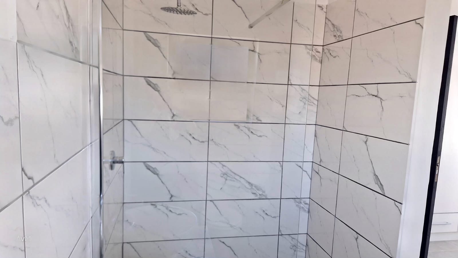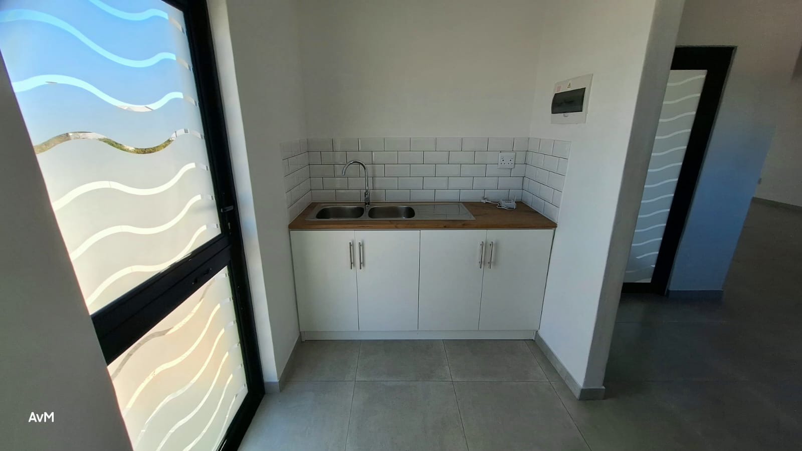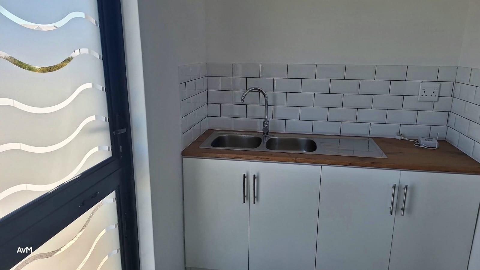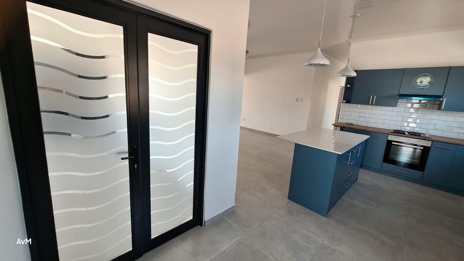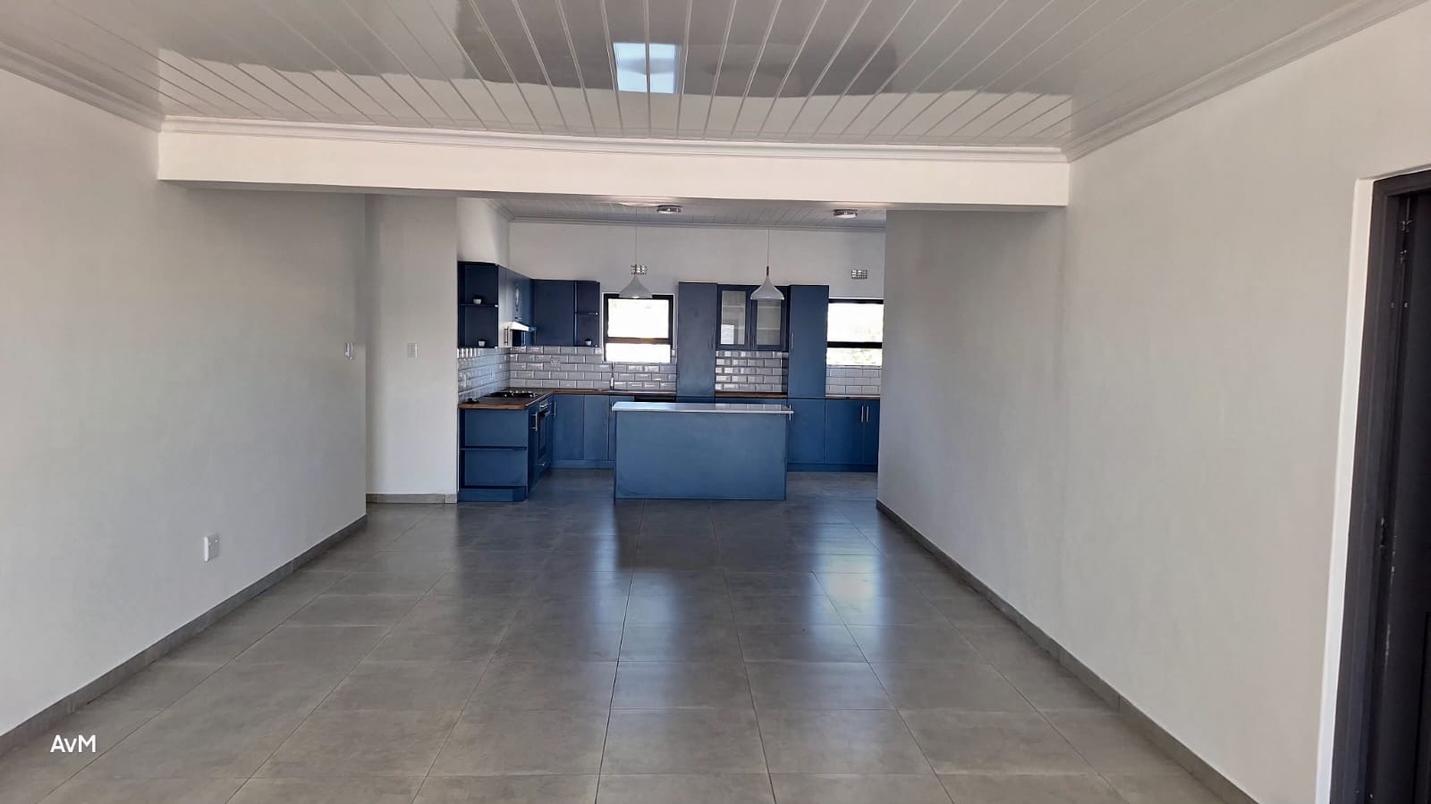 Step inside to an inviting open-plan layout, meticulously designed for contemporary living. The spacious lounge and dining areas flow seamlessly, characterized by fresh white walls and light grey tiled flooring that extends throughout the home, creating a bright and airy ambiance. The heart of this residence is the modern kitchen, a true highlight with its stylish blue cabinetry, crisp white subway tile backsplash, and warm wooden countertops. A functional kitchen island, featuring a contrasting light-colored surface, provides additional workspace and a central gathering point. The kitchen is equipped with new built-in appliances, including an oven, hob, and extractor fan, ensuring a delightful culinary experience. Ample storage solutions contribute to a clutter-free environment, while contemporary pendant lighting adds a touch of sophistication.