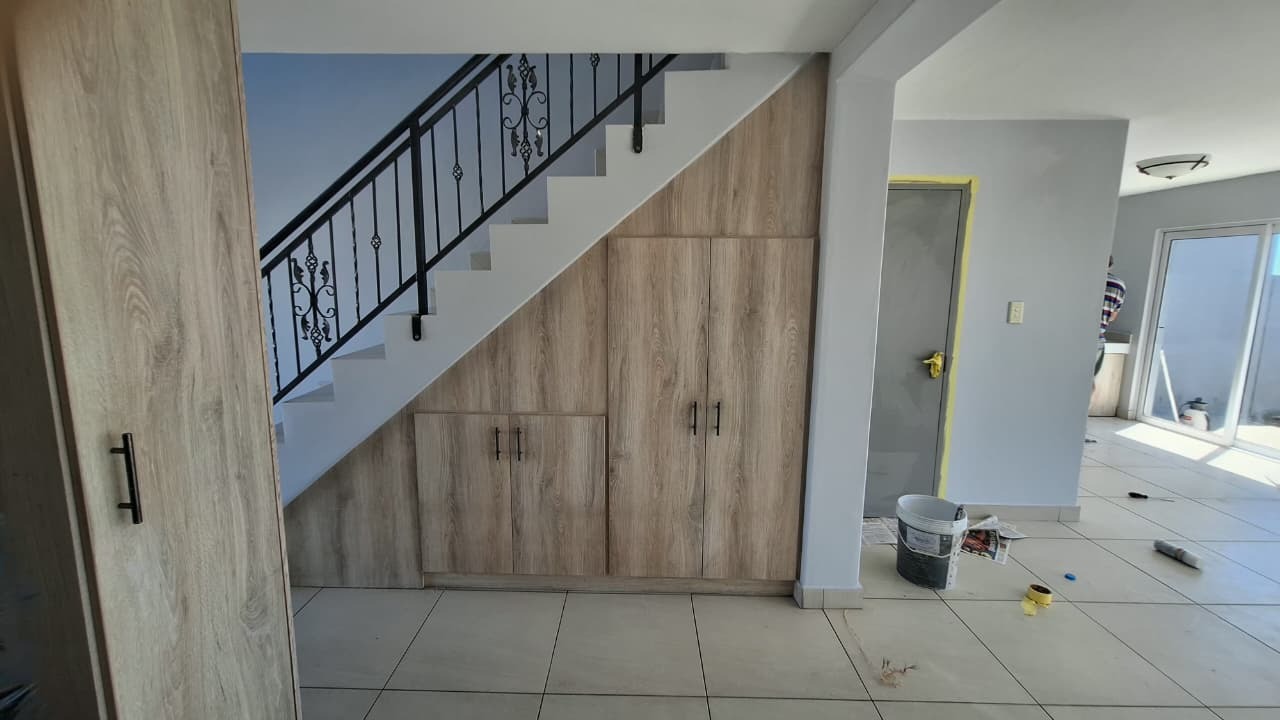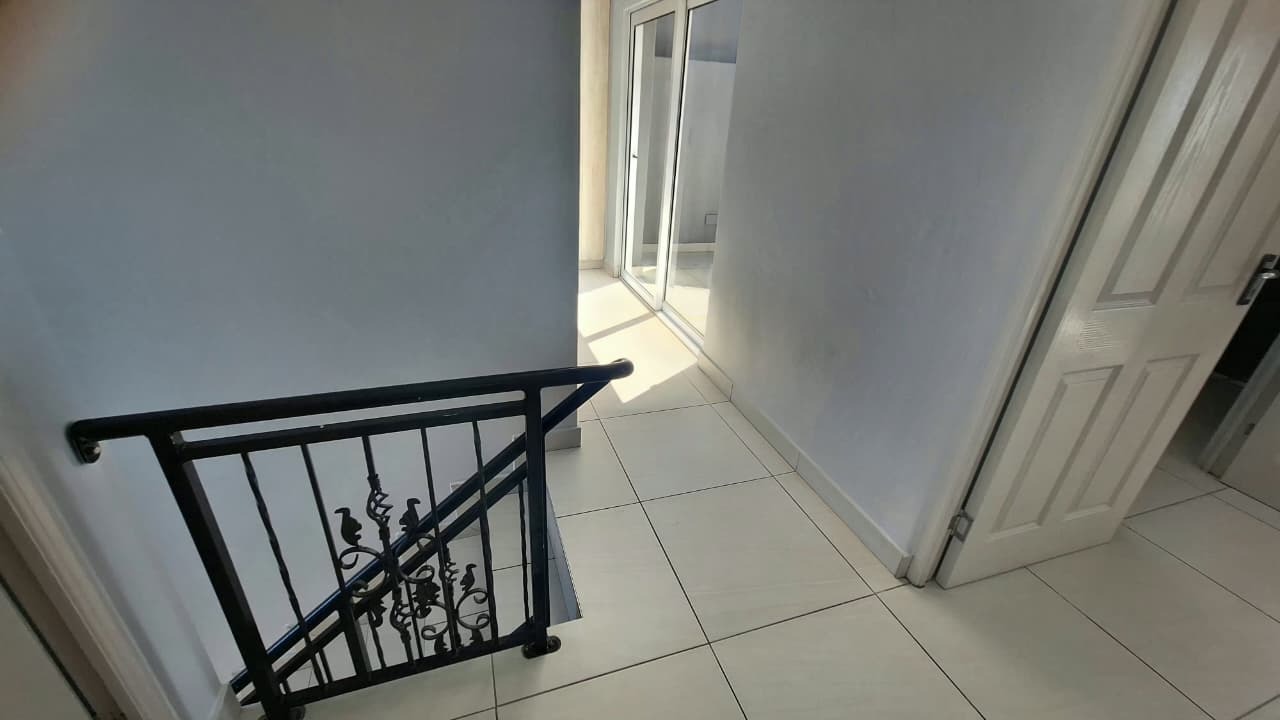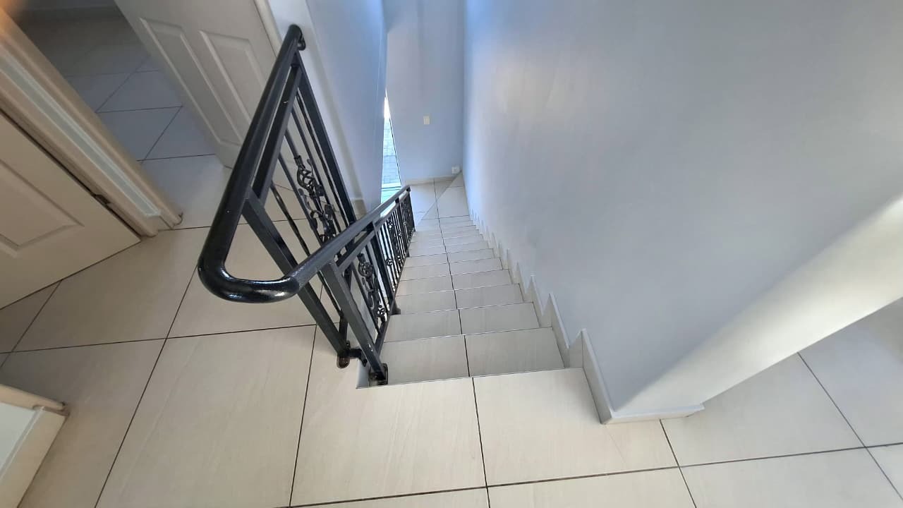Step inside to an inviting open-plan living area, designed for seamless flow and modern comfort. The interior features durable tiled flooring throughout and light grey walls, creating a bright and airy atmosphere. A stylish black metal railing adorns the staircase, leading to the upper level, while clever under-stair built-in cabinets offer practical storage solutions. The ground floor also includes a convenient guest toilet, fully tiled for easy maintenance, ensuring functionality for residents and guests alike. The contemporary kitchen, visible from the open-plan space, is ready for your culinary adventures.