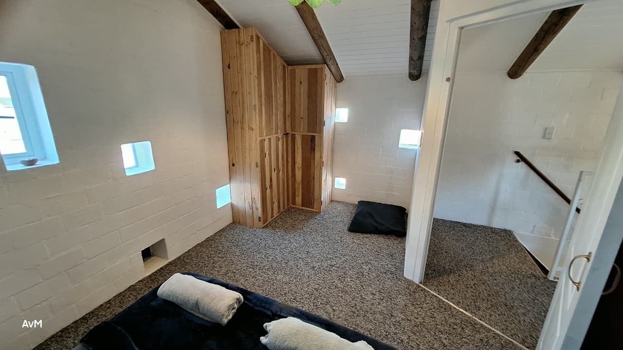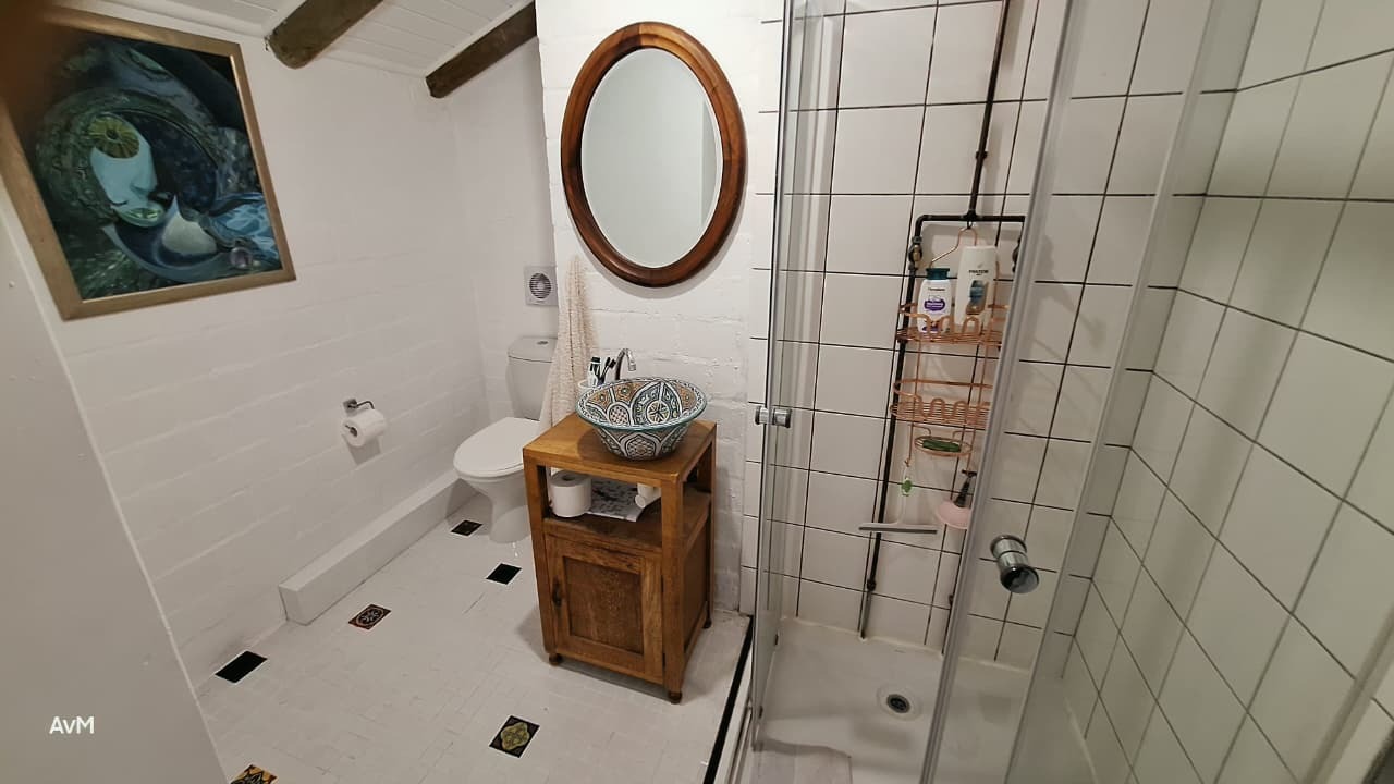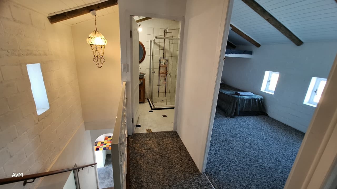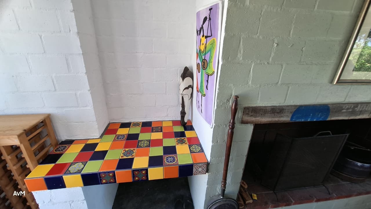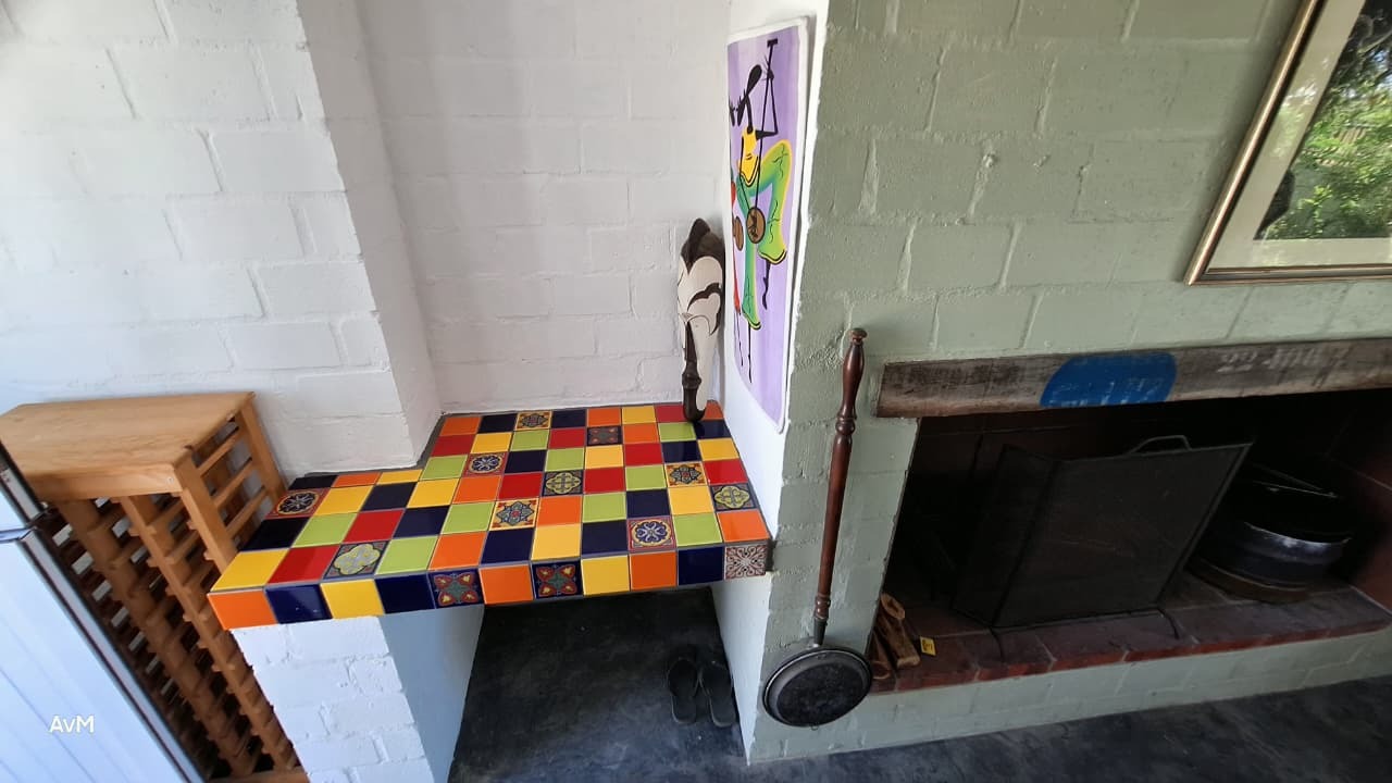 Inside, you’ll discover a unique and eclectic open-plan living space that truly feels like home. The lounge, dining room, and kitchen flow together beautifully, making it super easy to entertain or just chill out. Imagine cozy evenings by the fireplace, which features a vibrant, multicolored tiled counter that adds a real pop of character. The white painted brick walls and concrete-style flooring give the space a rustic yet clean feel, while a large window lets in plenty of natural light. The kitchen is practical and charming, boasting an L-shaped setup with ample storage, a classic farmhouse sink, and a spacious dining table – perfect for family meals or hosting friends.