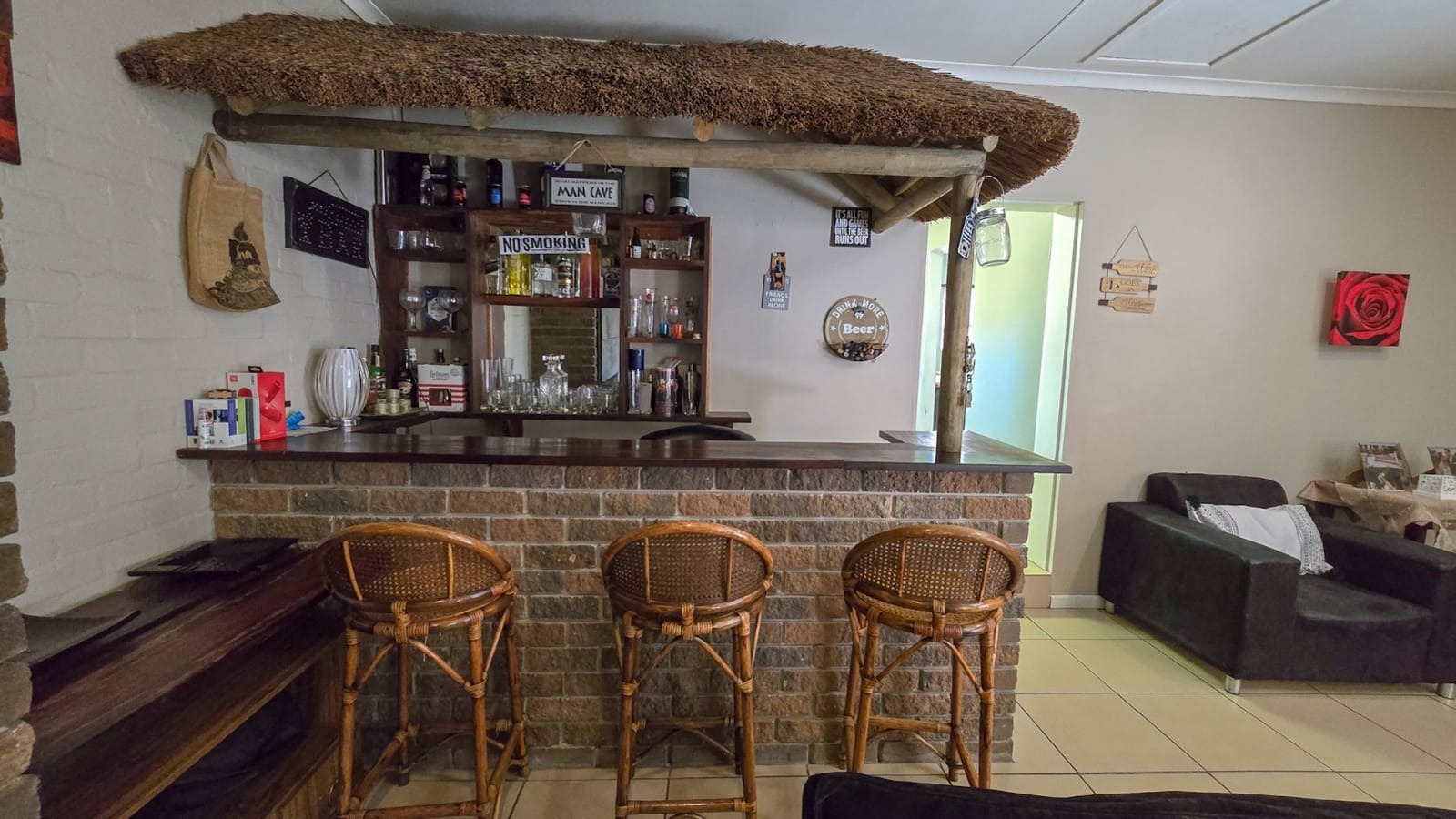 * Open-plan living with unique thatched-roof bar and fireplace