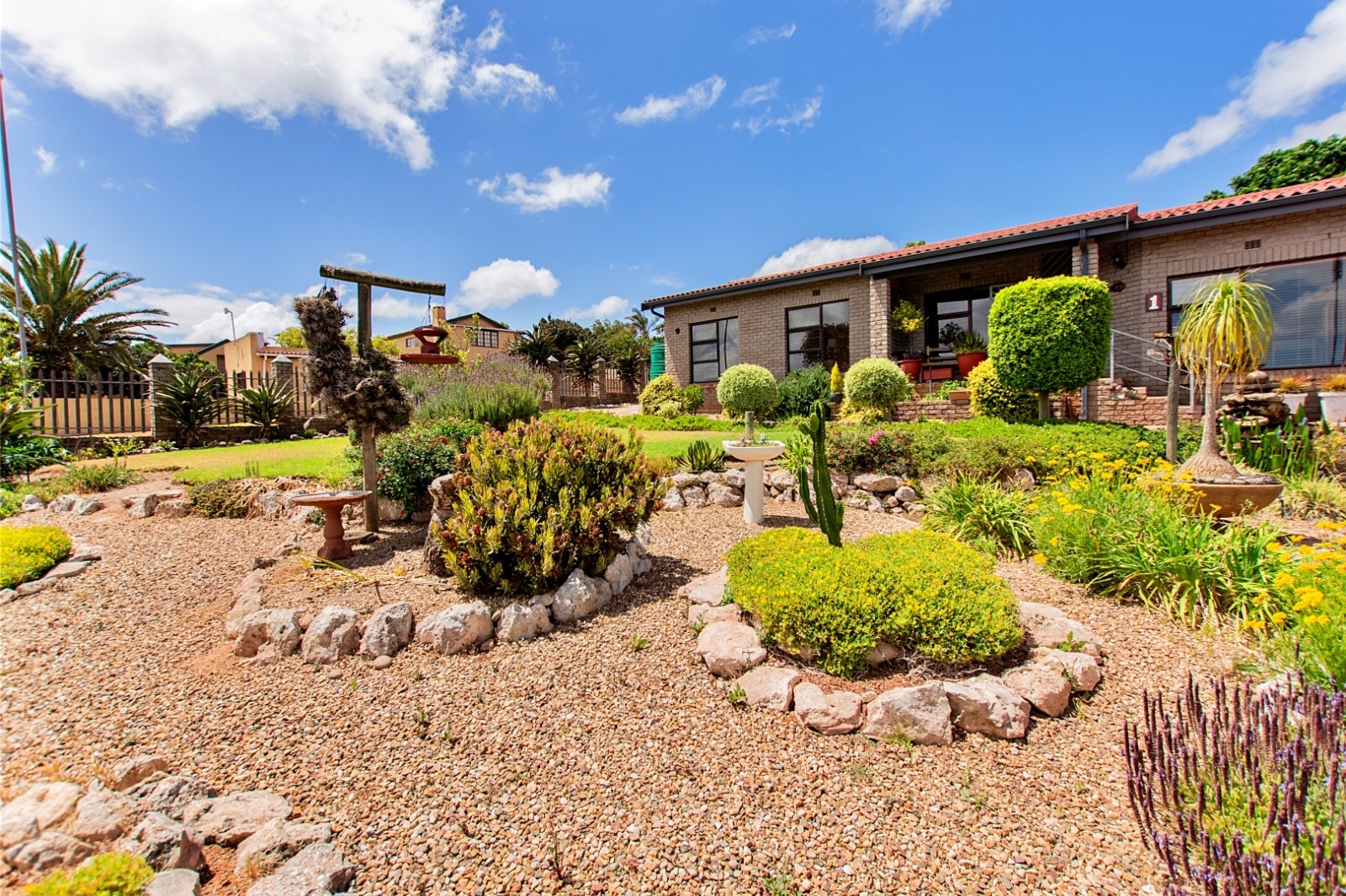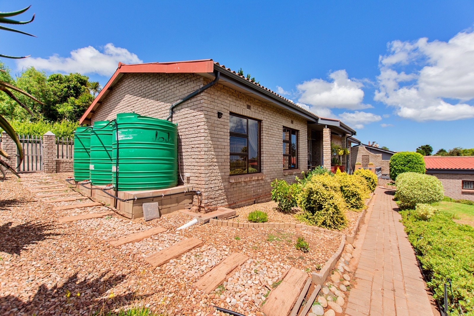 Step outside to a landscaped terraced garden that creates a tranquil outdoor setting, complete with water tanks for added efficiency and a Wendy house for extra storage or versatile use.
