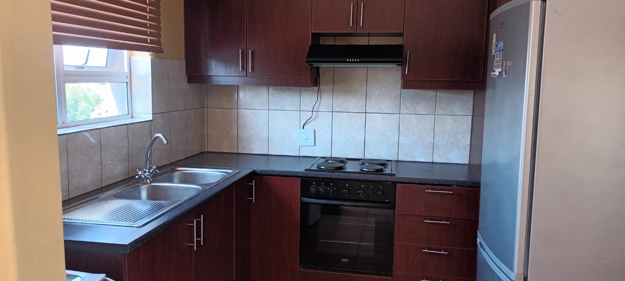 The kitchen is equipped with dark wood cabinets, an oven and stove, plus there's a handy spot for your washing machine. Step out from the living area onto your private, tiled balcony – perfect for enjoying those scenic views and a breath of fresh air. Both bedrooms come with built-in wardrobes, offering good storage, and large windows with blinds for privacy.